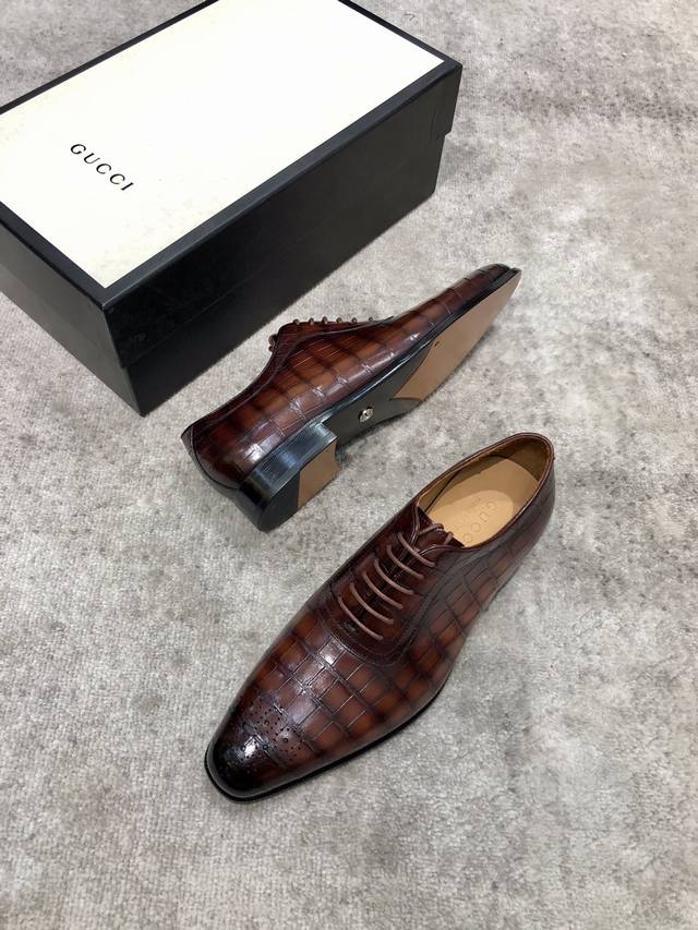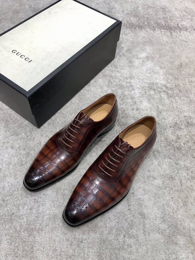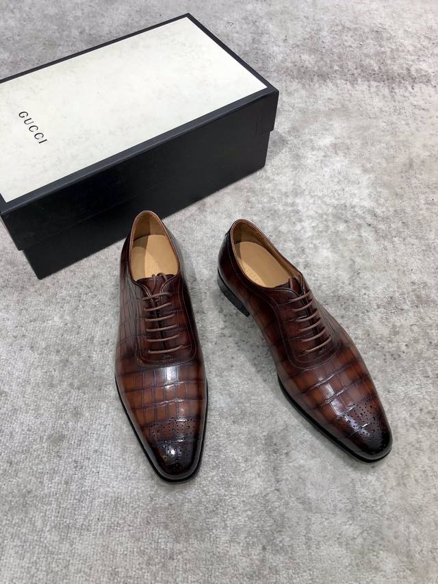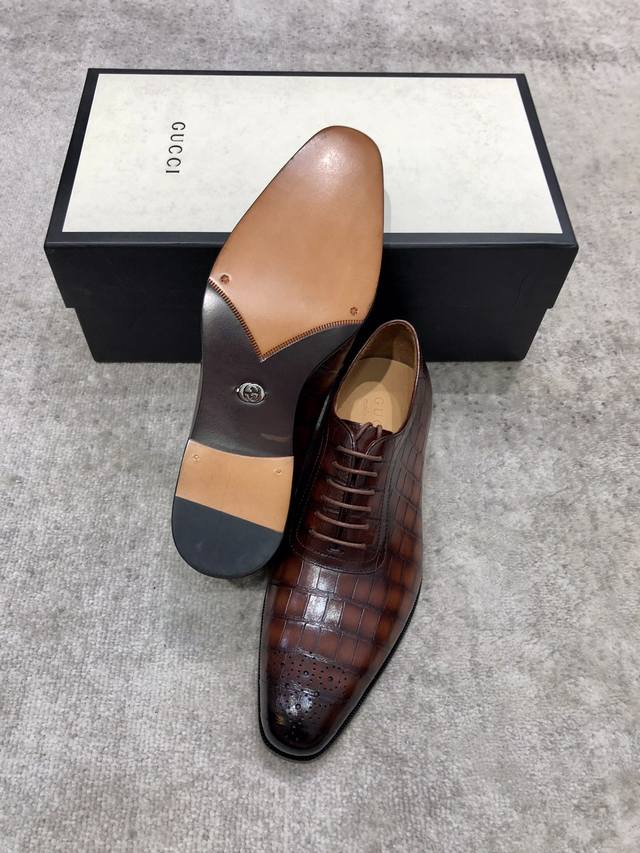 调工厂P价 男装男鞋 运动原单 Gucci 男士经典牛津鞋男士商务正装皮鞋 经典款 极致艺术 全鞋采用进口打蜡饮奶牛牛皮古法手工描改擦色 棕色 精挑细选 毛孔细