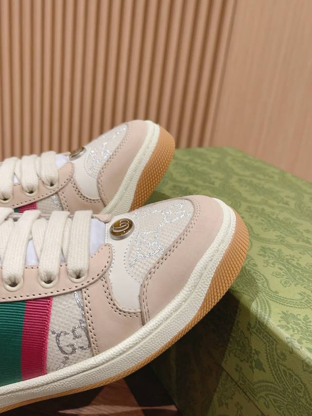 顶级版本 #情侣码数# Gucci Screener 古驰系列运动小脏鞋,全部按zp升级空胶工艺,皮料和大底一次性做旧成型,而非市场货后期做旧,看上去非常廉价的颜色。內里是按照正品一致定制的棉纱混纺毛巾內里,厚度、透气性、手感都和正品一致。正品开模牛皮垫脚,冲压成型,而不是市场普通版本的手工开料。按原版开模的金属双g椭圆形珐琅五金,最新的大底相比之前的版本细节有所调整,我们同样做了升级,独家私模和正品一致的tpr大底无论是软硬度、纹路的线条和清晰度以及穿着舒适度上,都完美还原原版工艺。市场通货的橡胶底不但