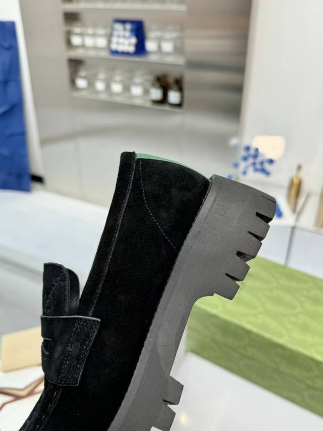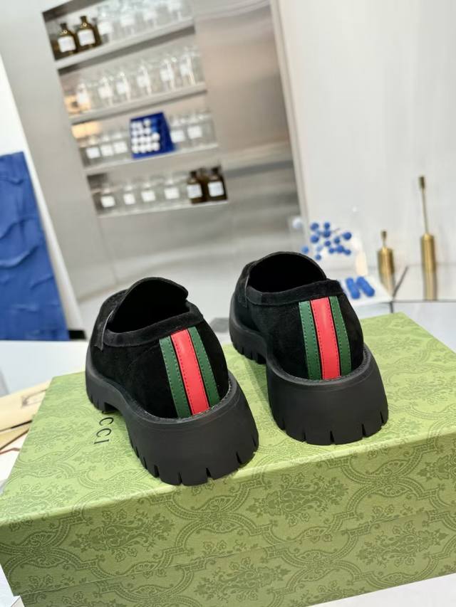 / Gucci乐福鞋 典藏图案继续在Gucci全新系列中大放异彩。全新系列匠心呈献,彰显品牌马术传承。这款采用皮革制作,搭配橡胶沟纹鞋底。 面料:进口牛京压花 码数