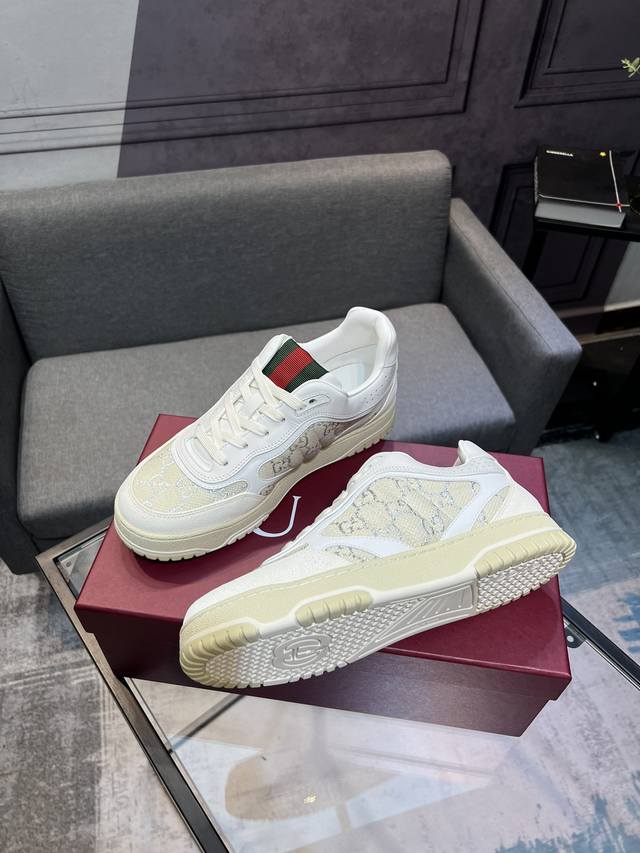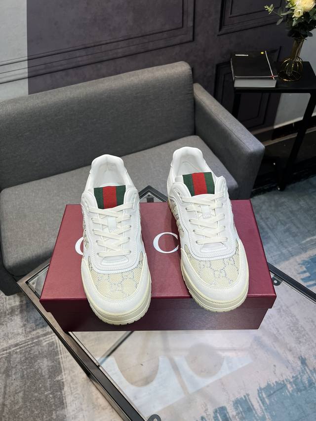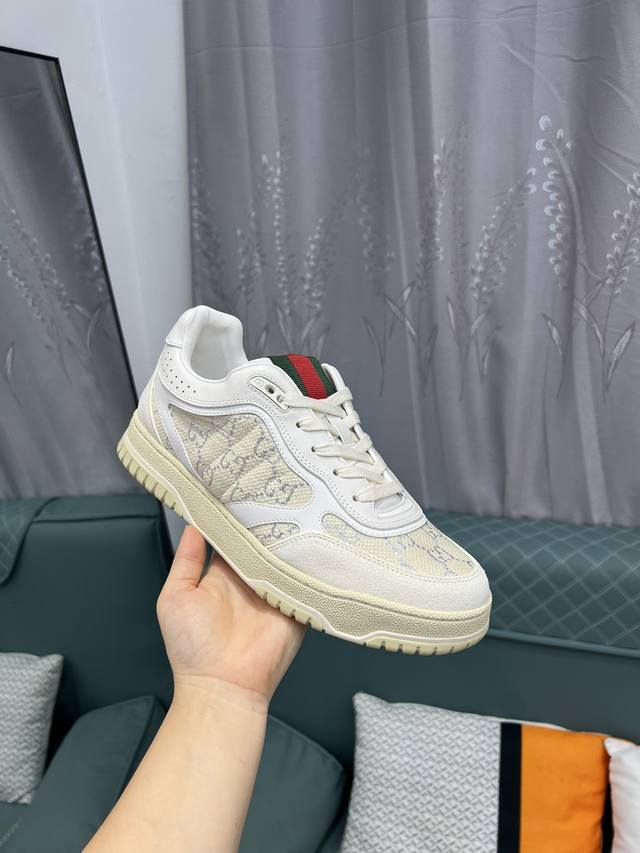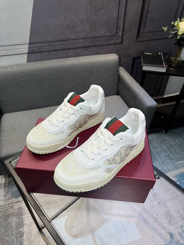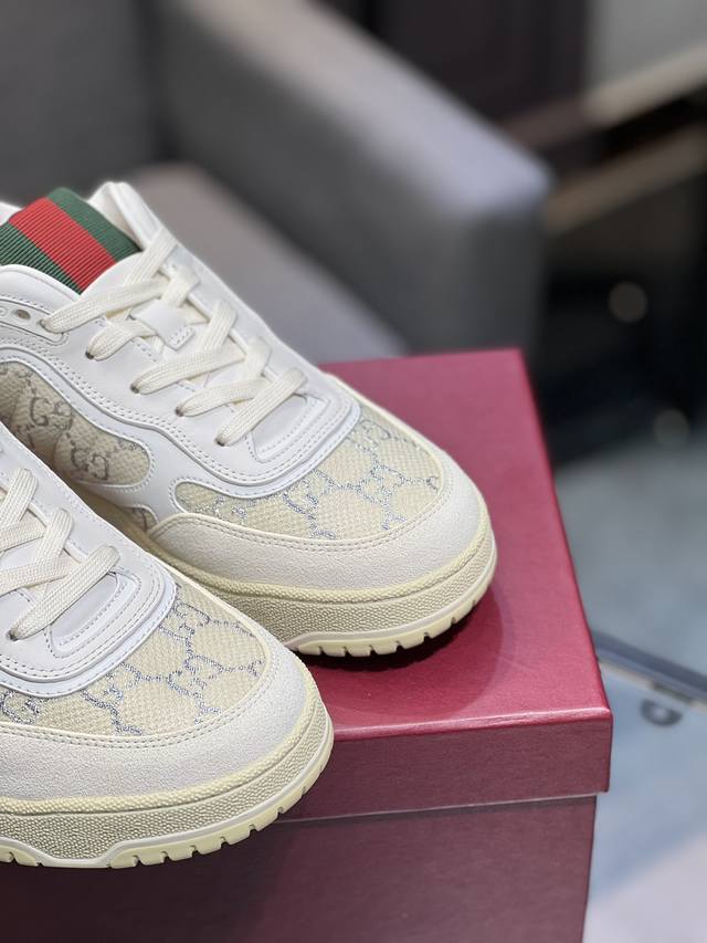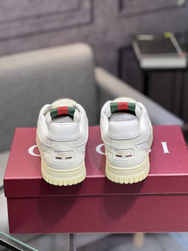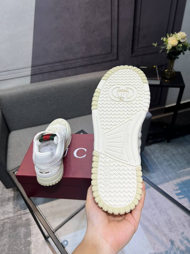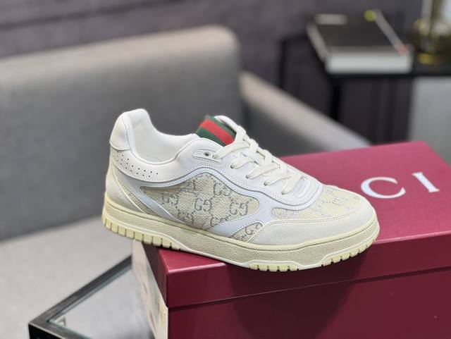 原版购入开发 做货,这款高低帮运动鞋采用篮球风格廓形设计,巧妙融入镂空拼片和做旧效果,尽显别样匠心。匠心融蕴互扣式双g造型配件和gucci字样等品牌标识细节,低调致敬品牌设计传承。