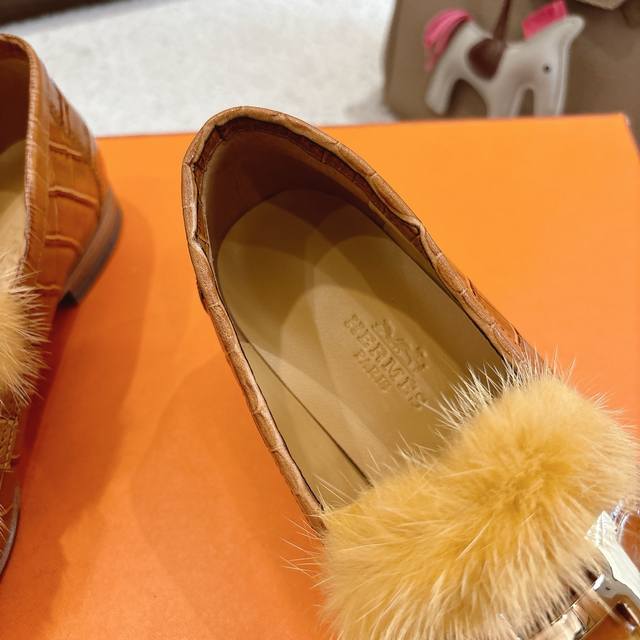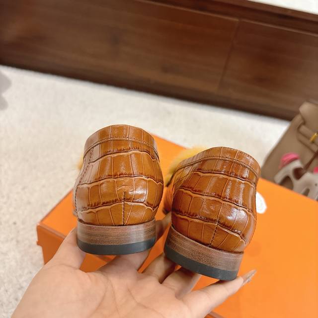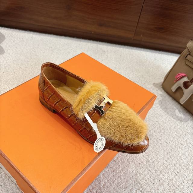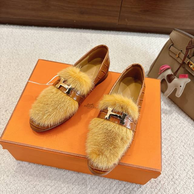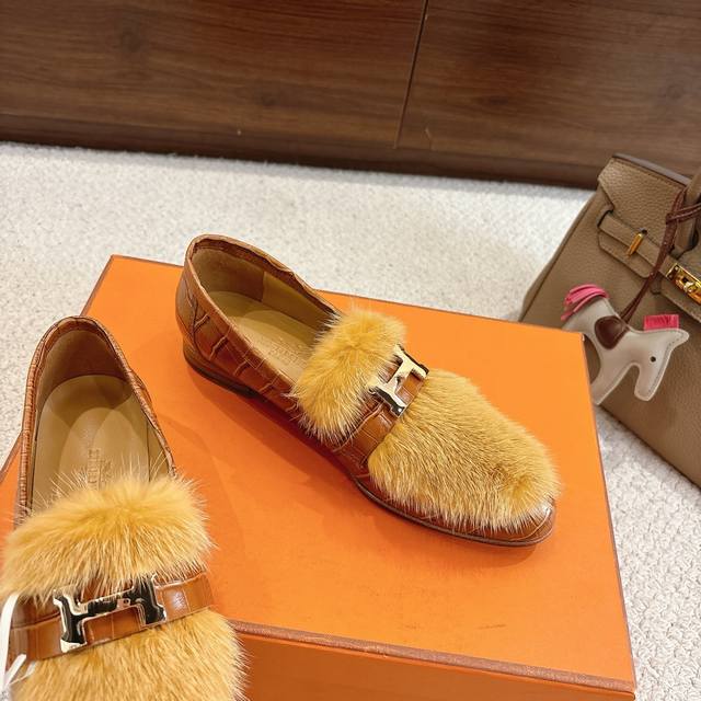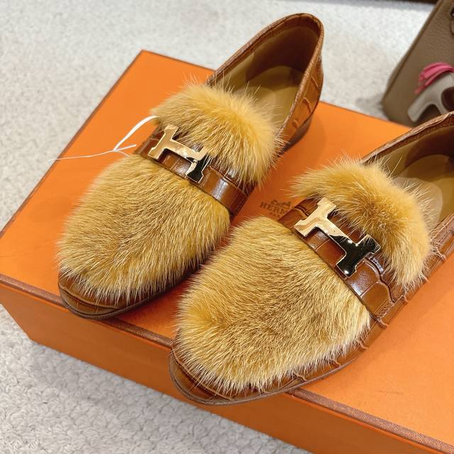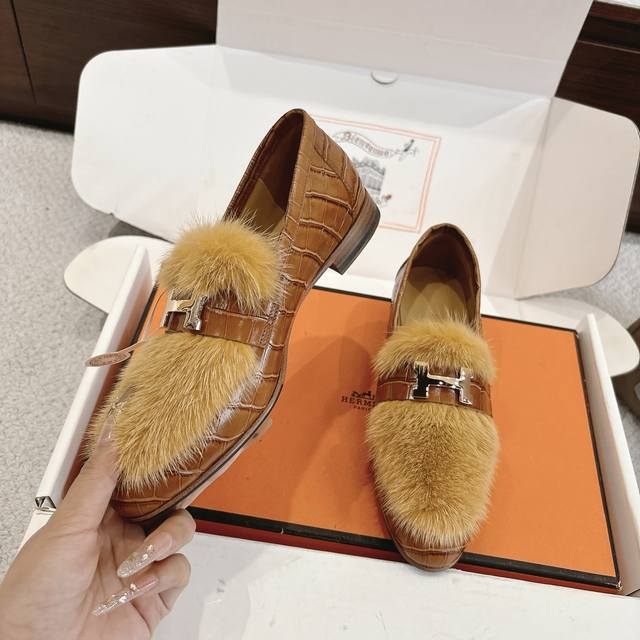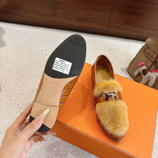 / 出厂价p 爱马仕Hermes paris 乐福鞋 New Arrival~ H家 秋冬水貂乐福鞋&半拖 鞋面是整貂,质感温和柔顺,一看就很贵! 鞋面麂皮,鞋底牛