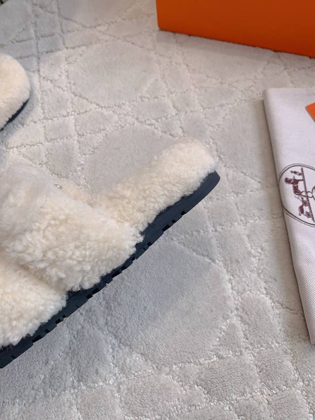 Herme*经典款二舅毛毛拖鞋 超级厚实的澳洲进口羊毛 犹如踩在云朵般的感觉 拉长腿部线条