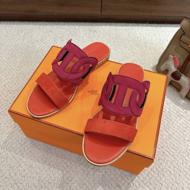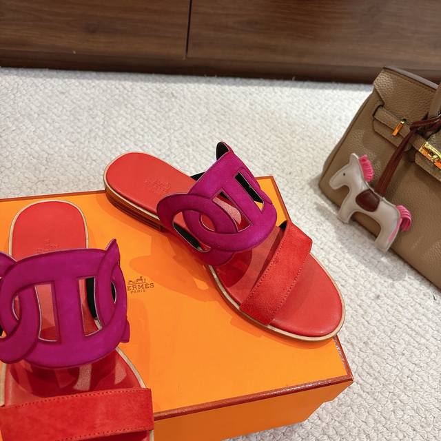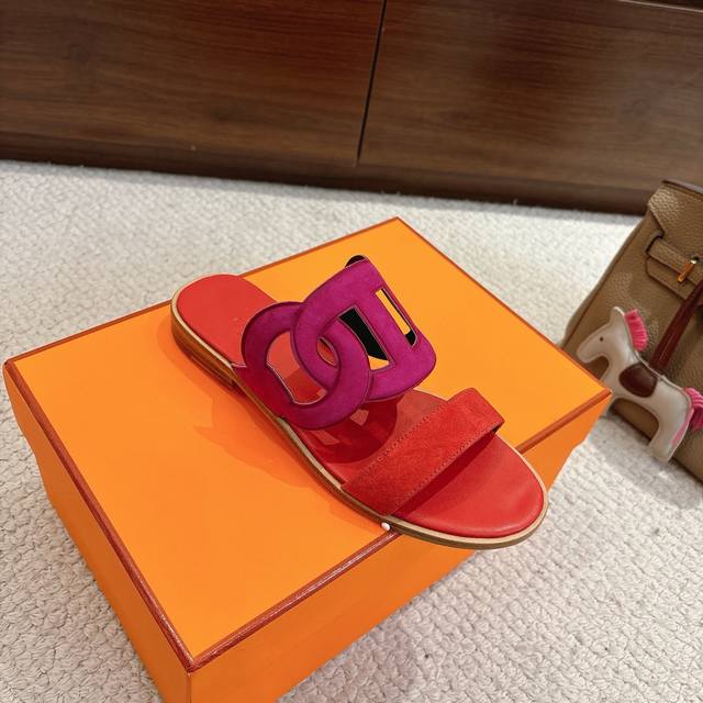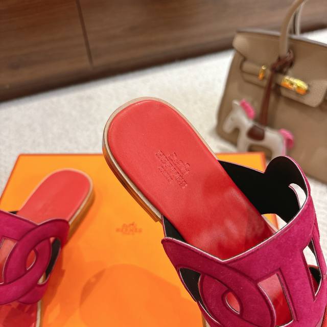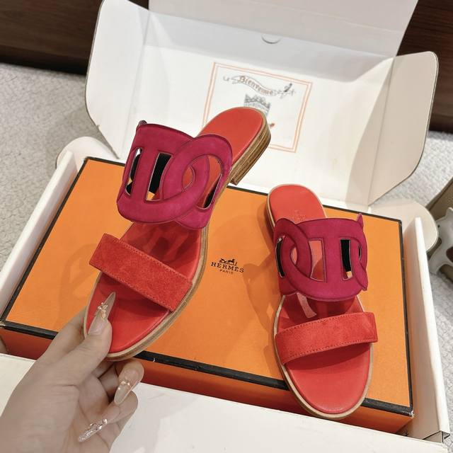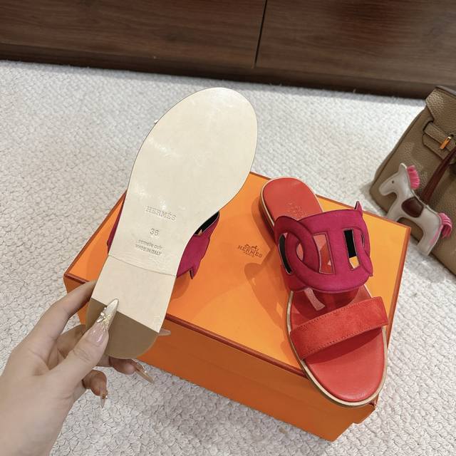爱马仕经典款H拖鞋 时尚简约风拖鞋小牛皮材质 经典“H'”镂空鞋面 女人的点睛单品!经典万能拖...
