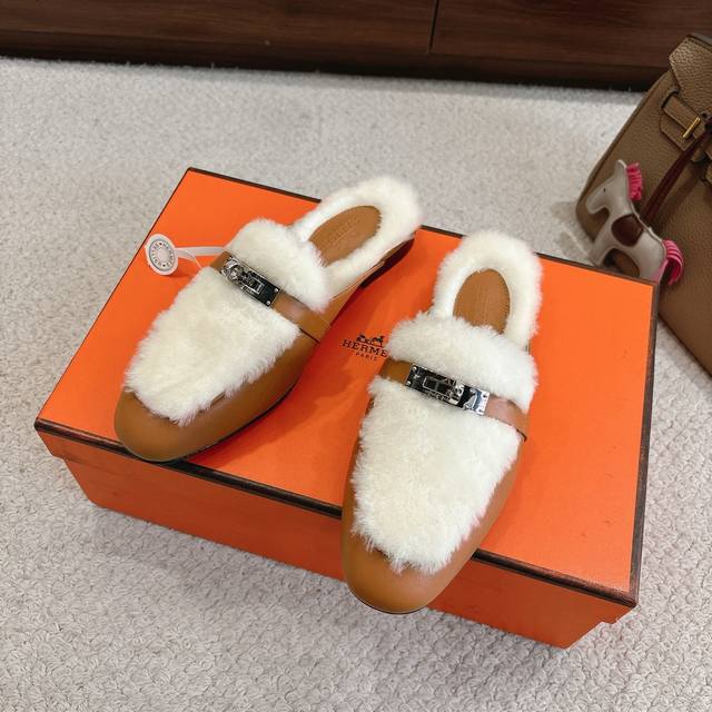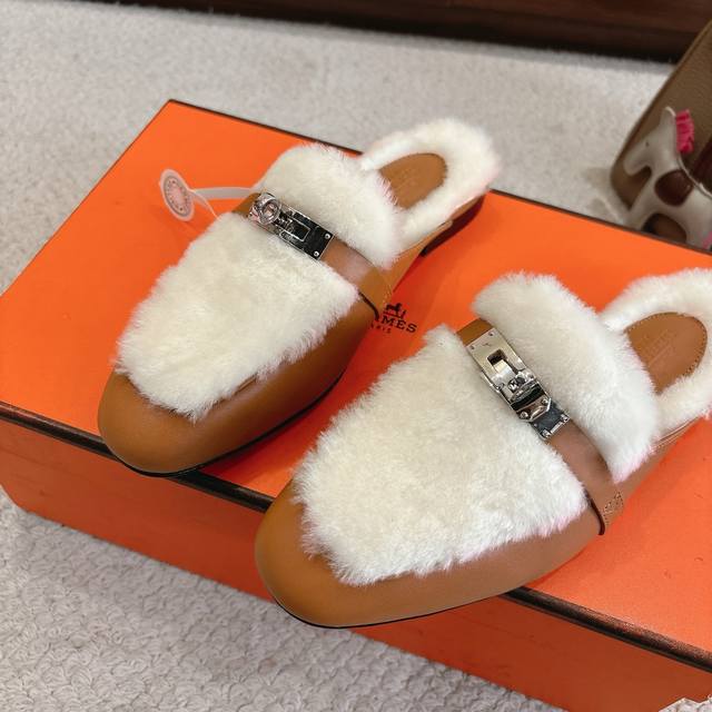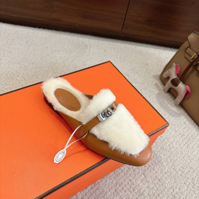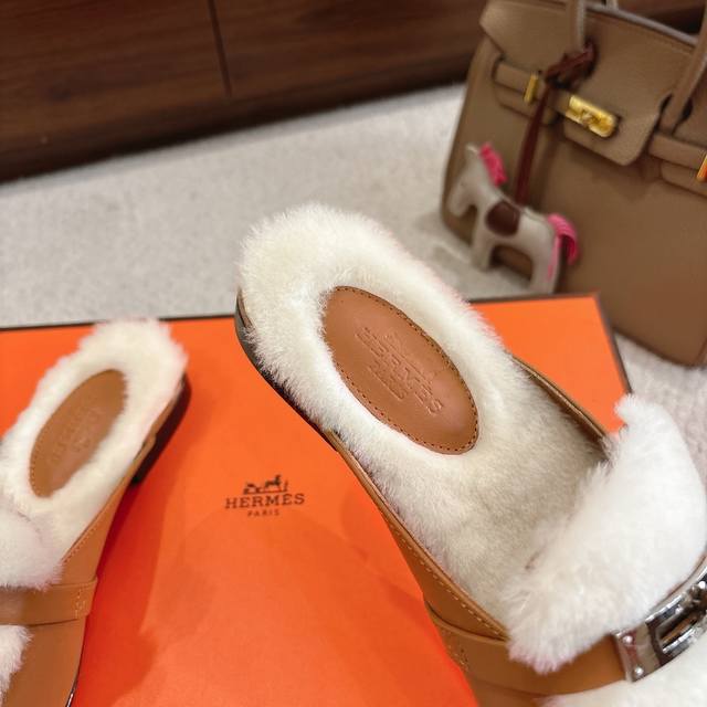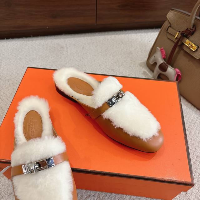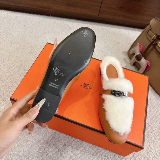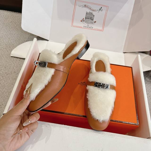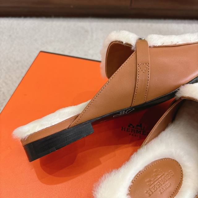 出厂价p Hermes Oz穆勒鞋 毛毛半拖系列 时尚又百搭 超级舒服 每个细节都做到极致 原版定制Nappa小牛皮 内里真羊毛 原版私模Kelly纯钢五金配件