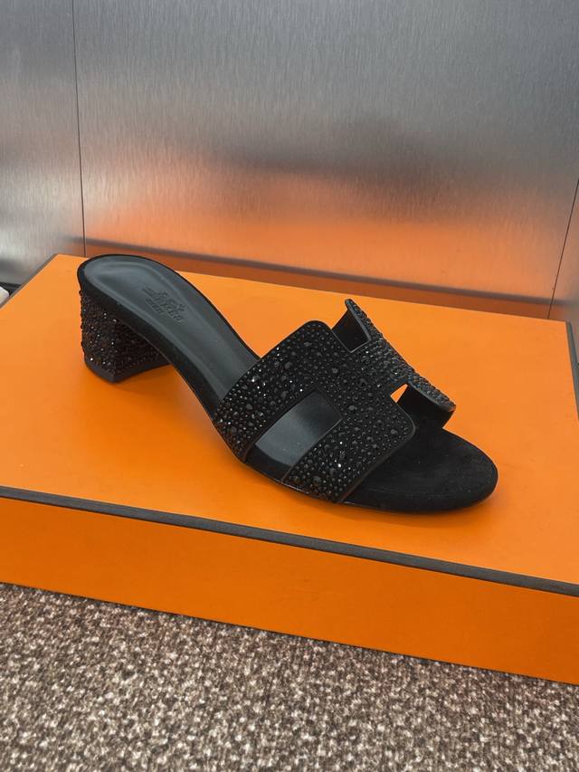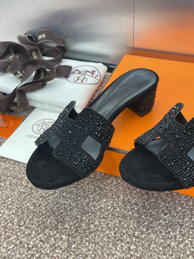 爱马仕 Hermes 春夏经典款 Oasis 粗跟拼色工字拖水晶女鞋 H家圆头露趾凉拖鞋