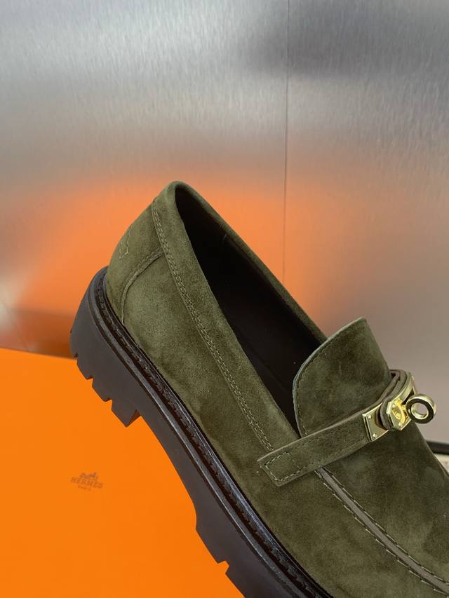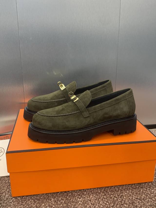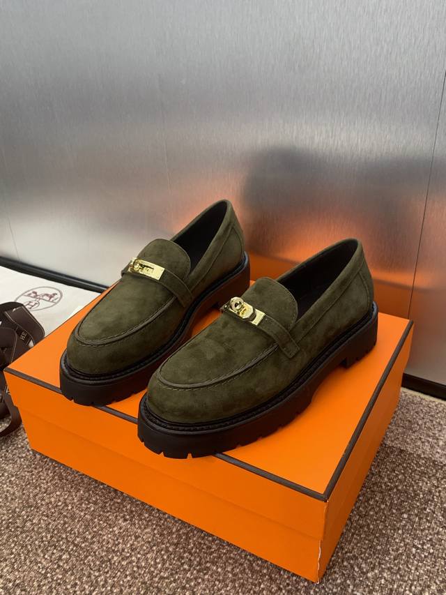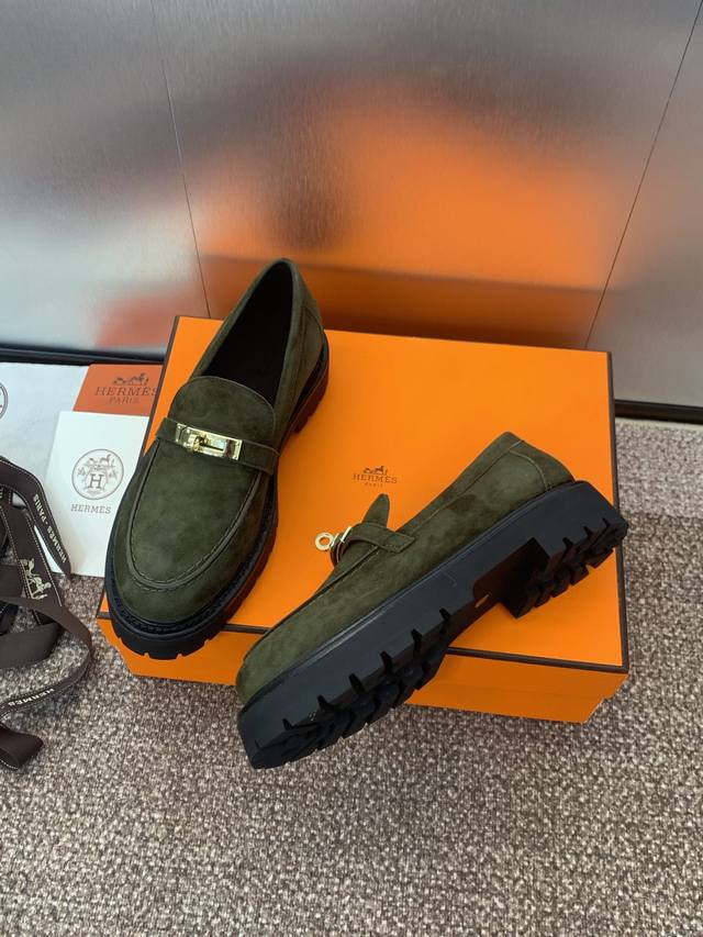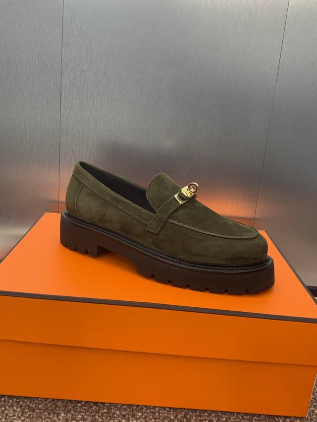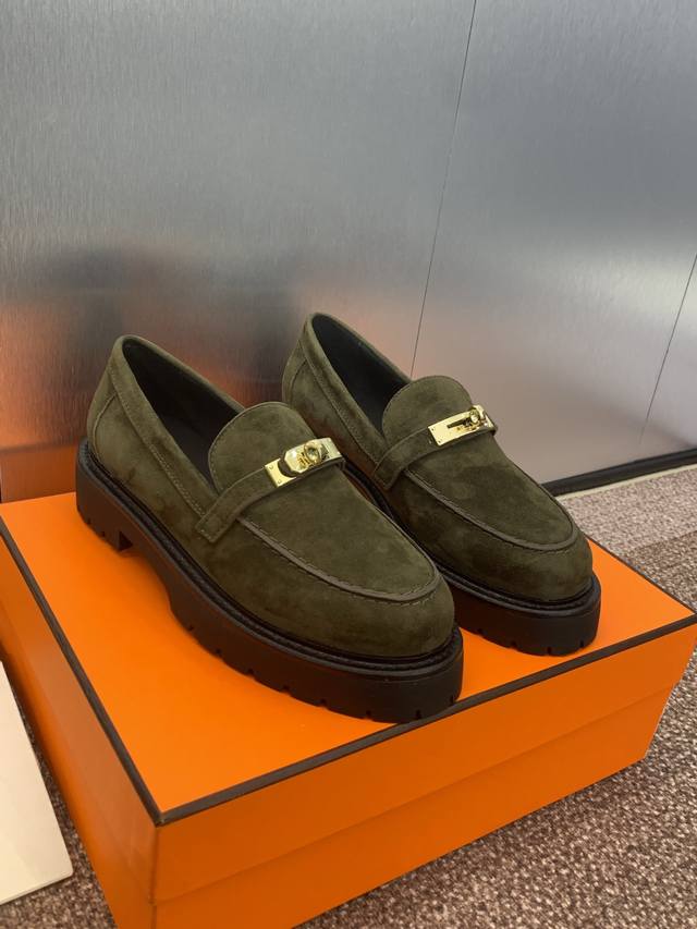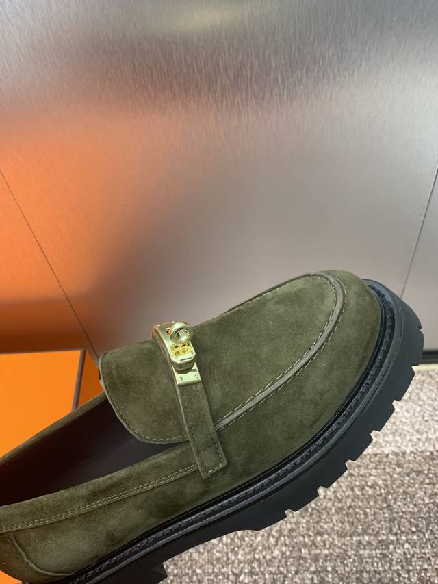 爱马仕 Hermes 2024秋冬新款 Kelly扣 Lcone拼色低跟羊羔毛女鞋 H家厚底圆头时尚休闲乐福鞋