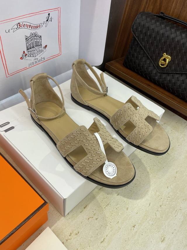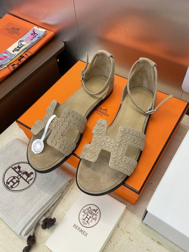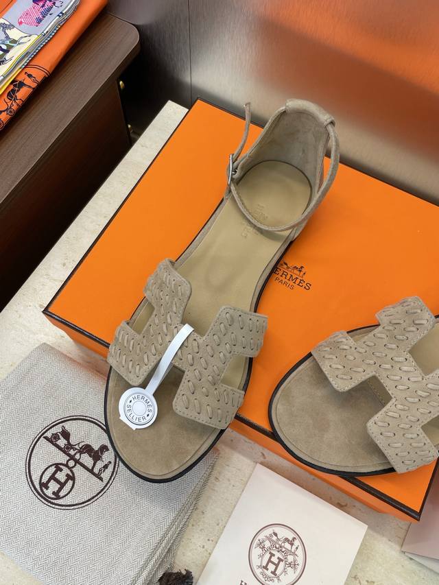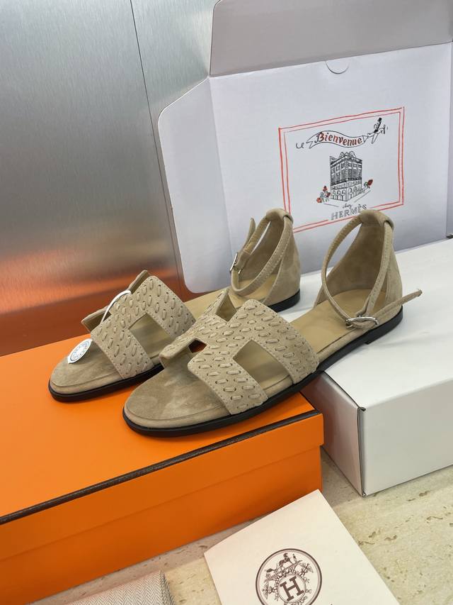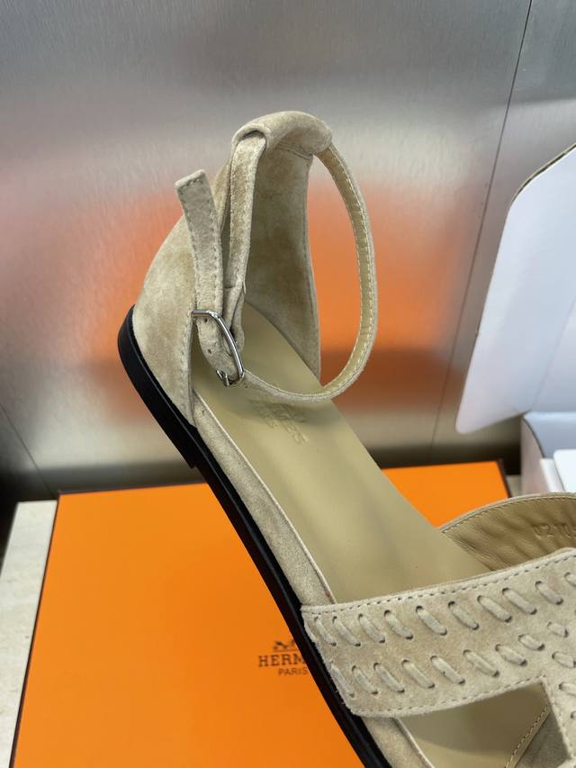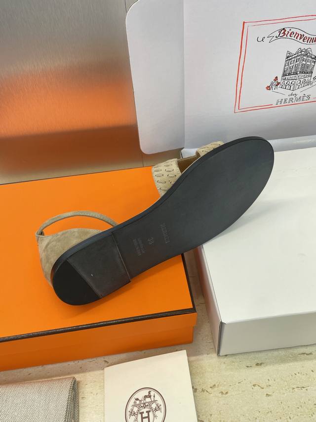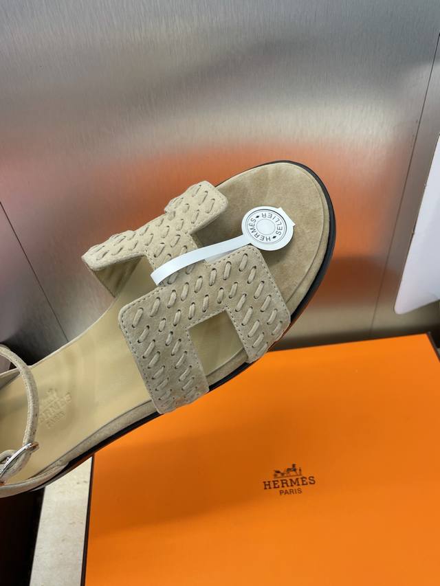 爱马仕 Hermes 2025春夏新色经典款 Santorini 拼色工字拖女鞋 H家平底圆头一圈带露趾中空凉鞋