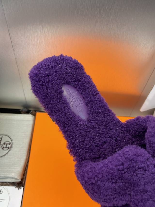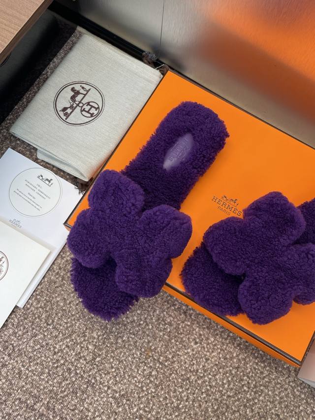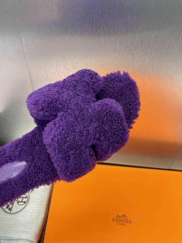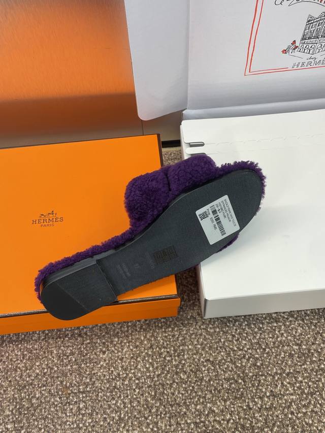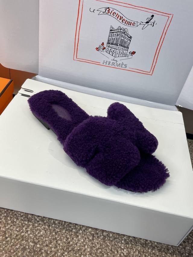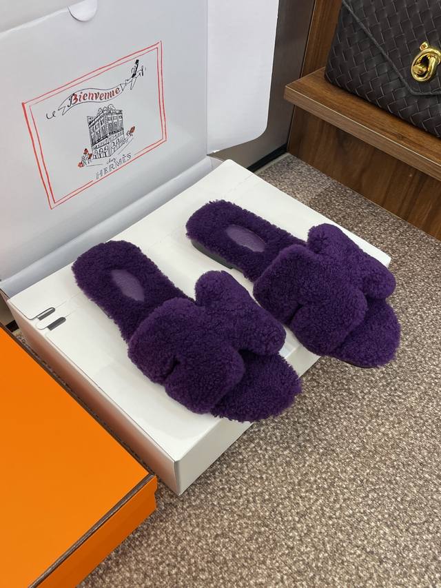 工厂p价p 莞货 代购级 爱马仕 Hermes 秋冬经典款 Oran 糖果色工字拖女鞋 H家经典平底圆头露趾羊羔毛拖鞋 材质:鞋面100%进口羊羔毛+意大利真皮