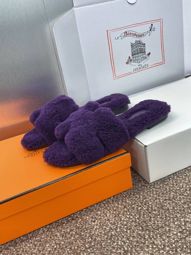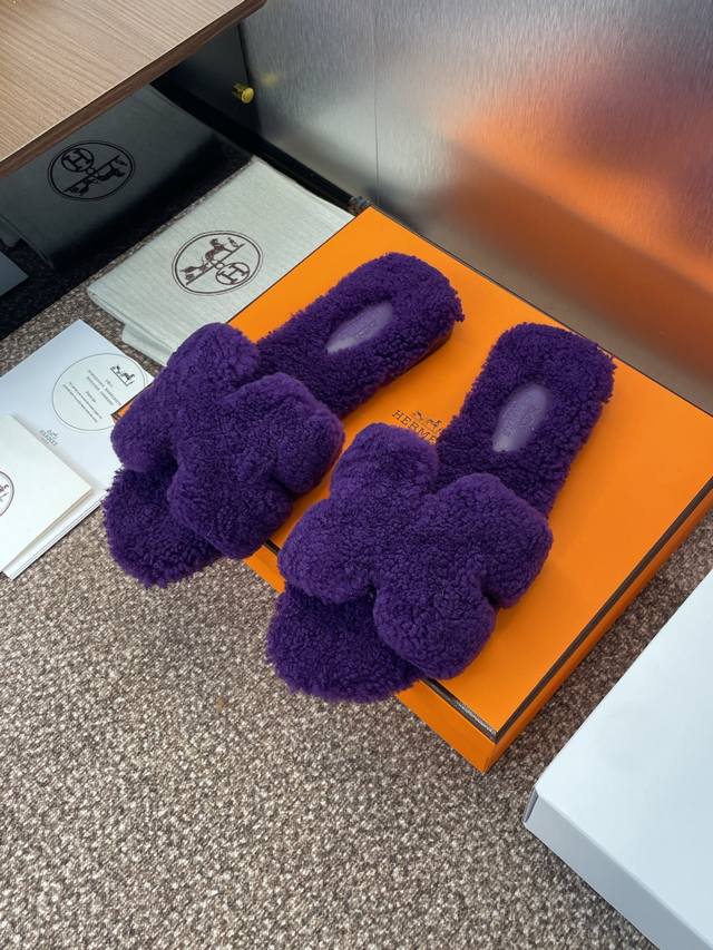 莞货 代购级 爱马仕 Hermes 秋冬经典款 Oran 糖果色工字拖女鞋 H家经典平底圆头露趾羊羔毛拖鞋