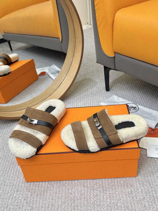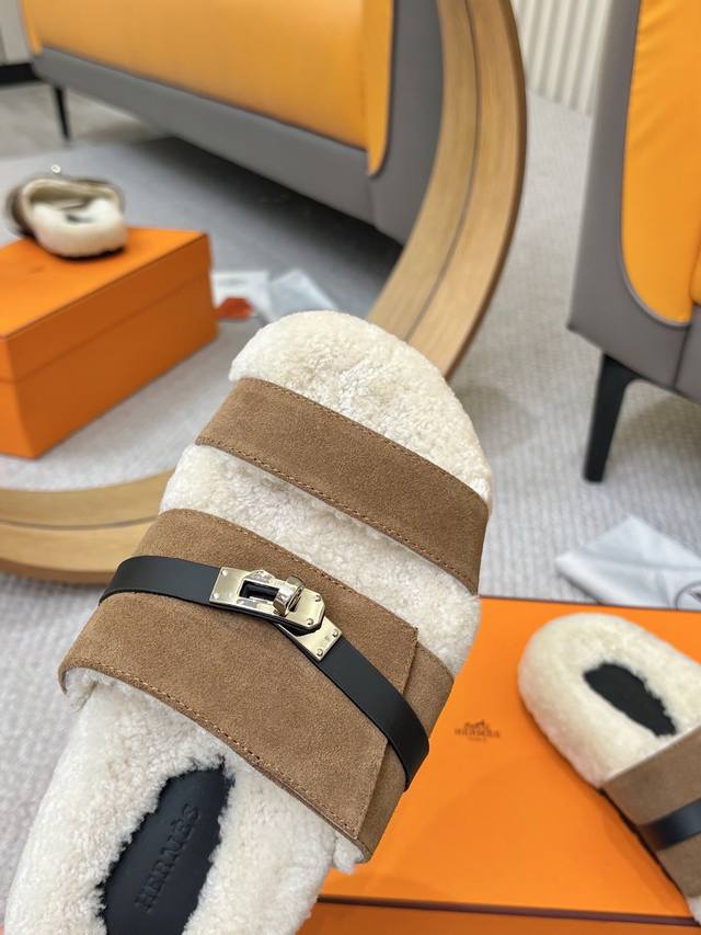 厂价Hermer 爱马仕经典kelly扣博肯毛毛拖鞋秋冬离不开毛毛拖居家出门逛街遛弯不要太方便蓬松的羊羔毛...