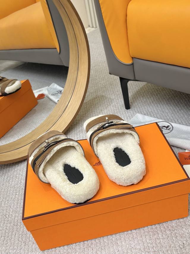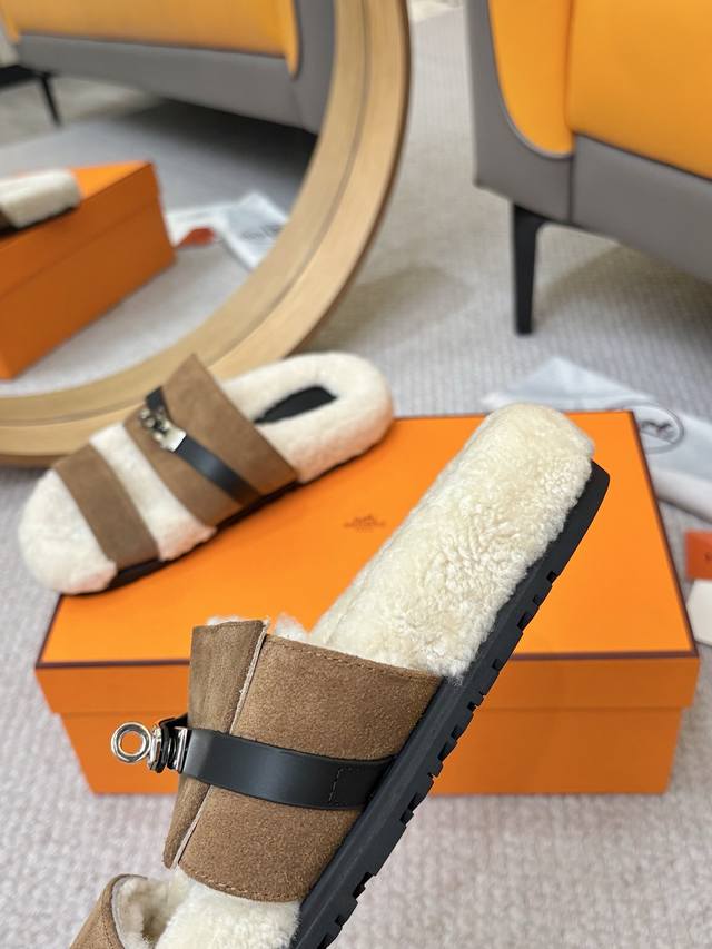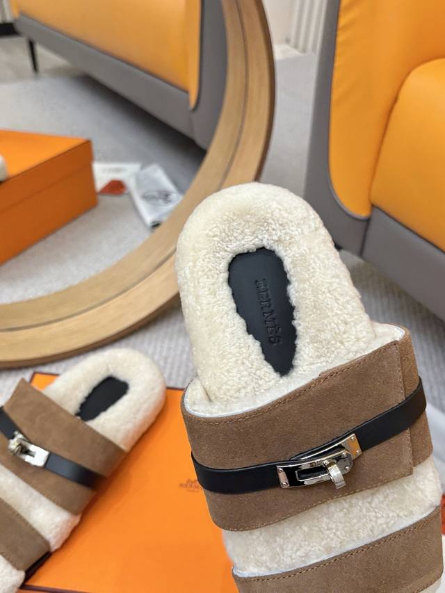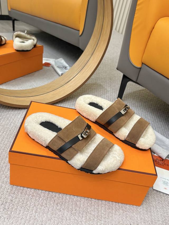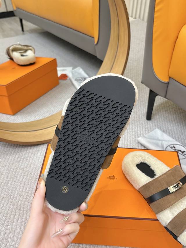 工厂p批p发 Hermes爱马仕2025秋冬Kelly毛拖鞋 Hermes爱马仕2025秋冬Kelly毛拖 超级百搭好看时髦 超多明星 随意舒适高级感 鞋面:进