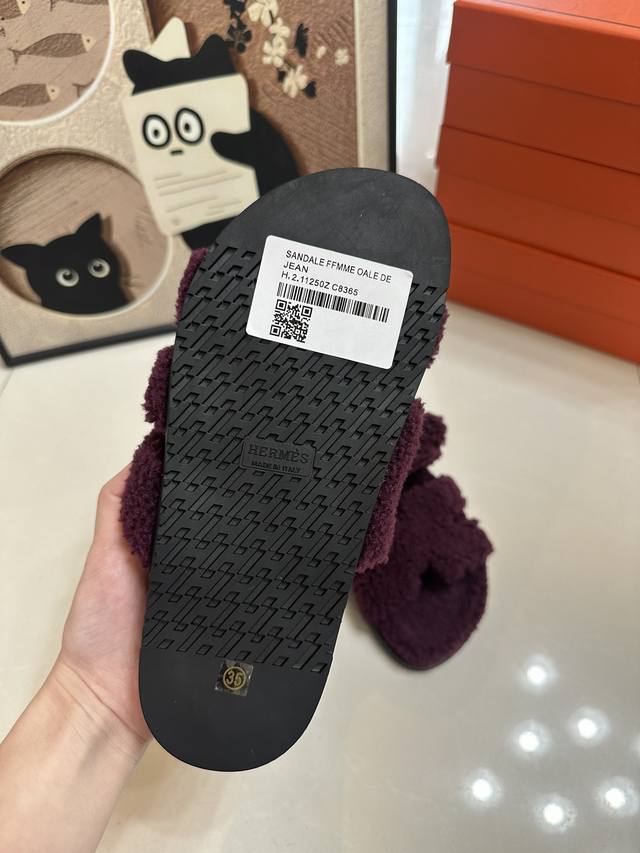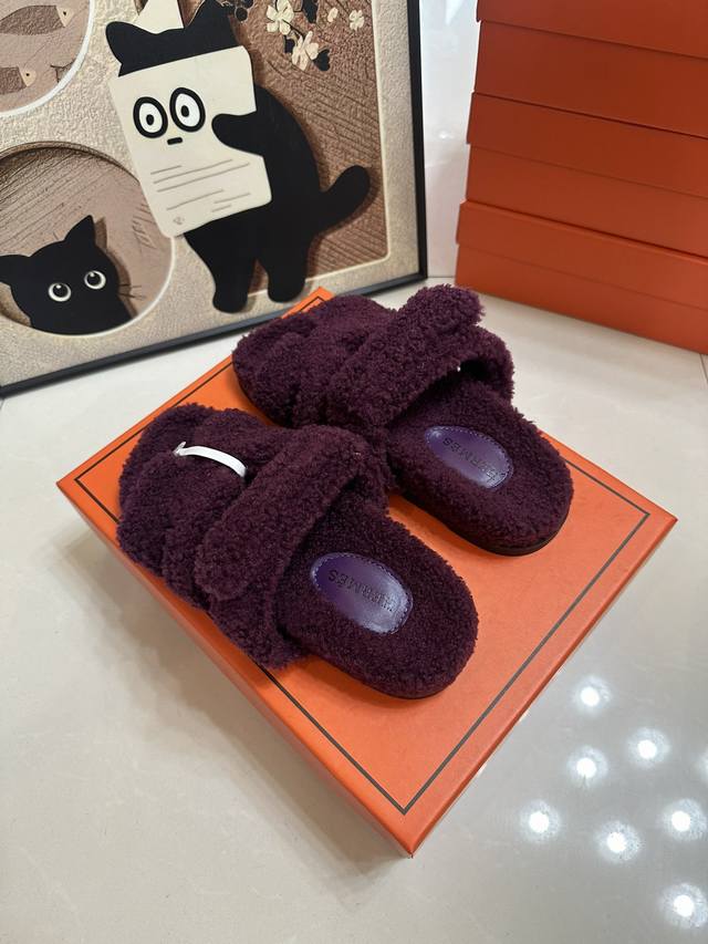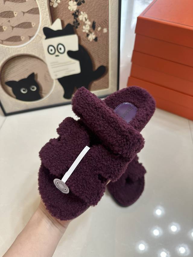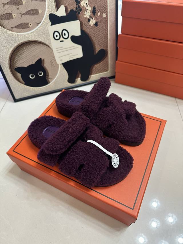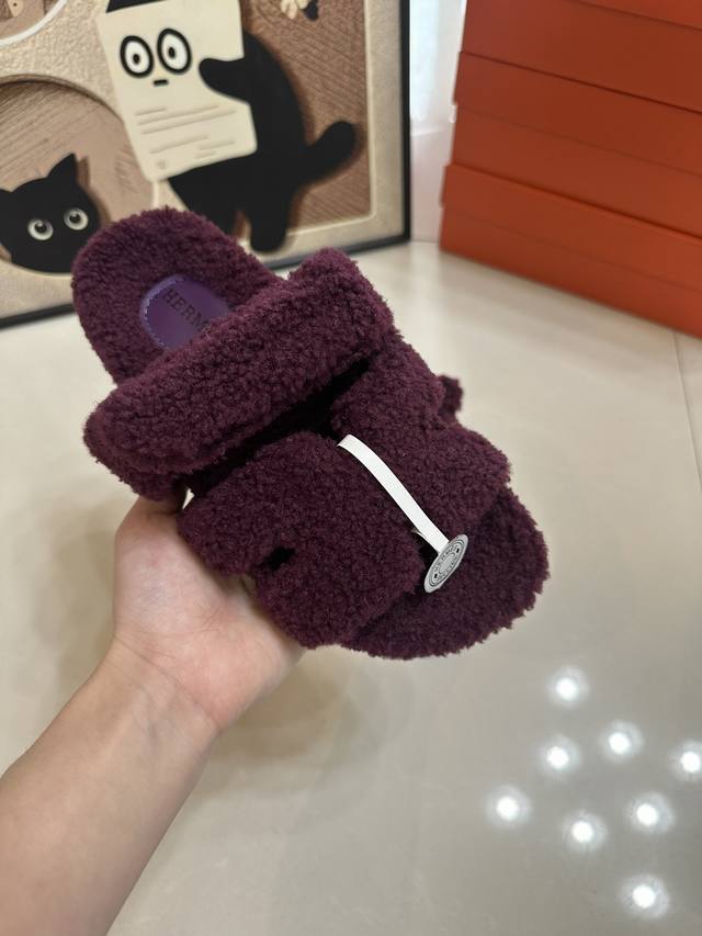Hermes 爱马仕秋冬新款 泰迪毛毛拖鞋 魔术贴二舅拖