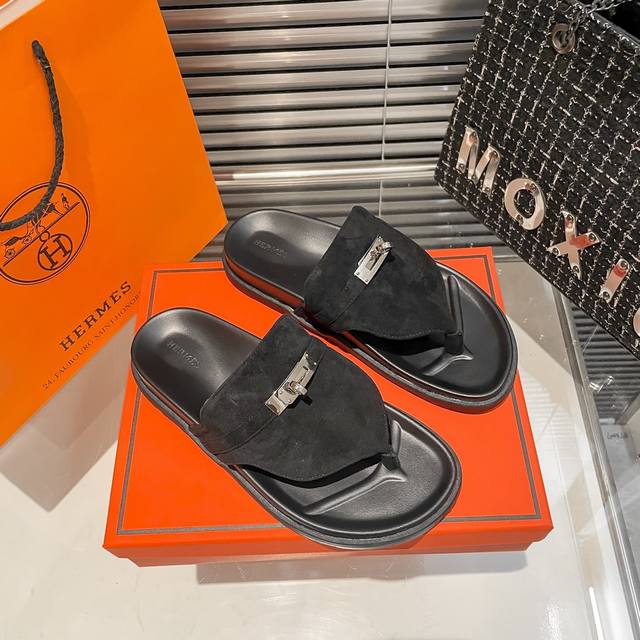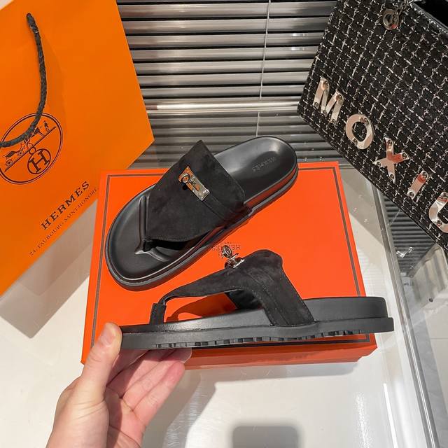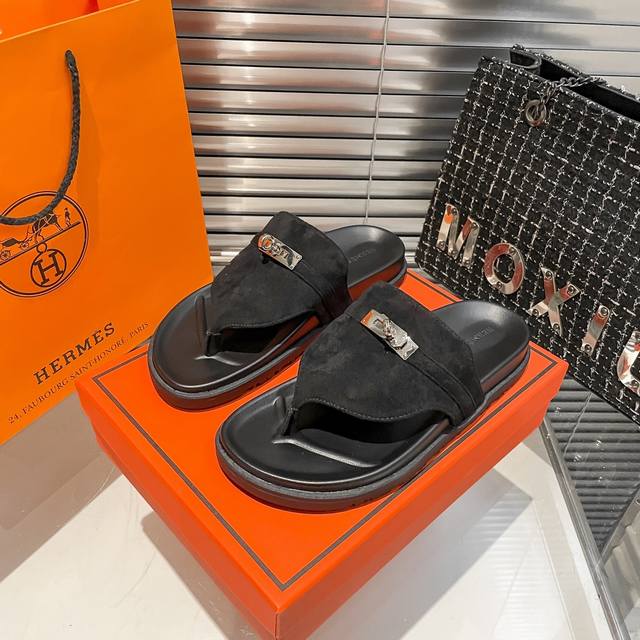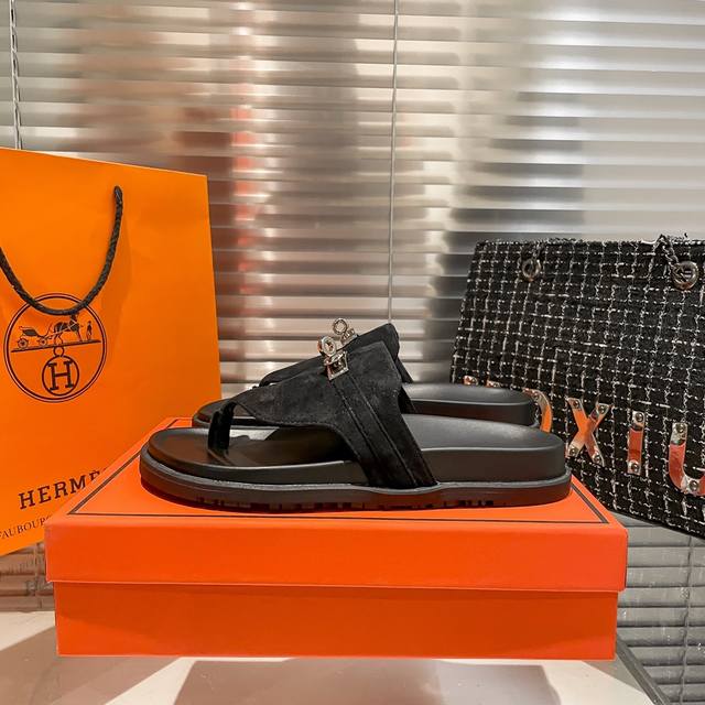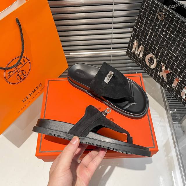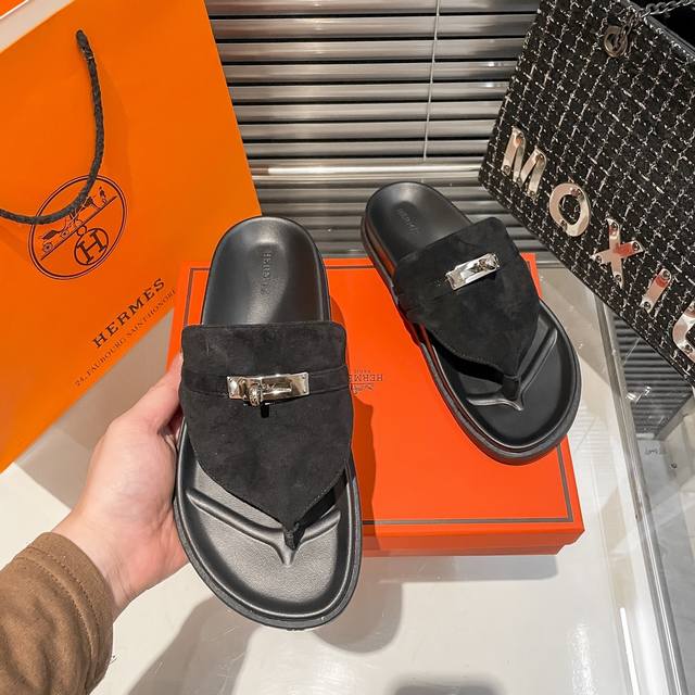 橙子出厂价 Hermes 爱马仕 早春新款 银扣夹脚人字拖 凉拖鞋 原版开模 代购版本 进口超迁皮 垫脚超迁 私膜真皮大底 全套专柜包装 码数:35-42