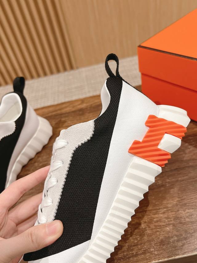 男+10 #爱马仕情侣款休闲鞋 麂皮搭拼接网布运动鞋 轻盈鞋底装饰撞色图案,打造百搭时尚风格 原版开模大底 Size:女码35-39 40定做 男码39-44