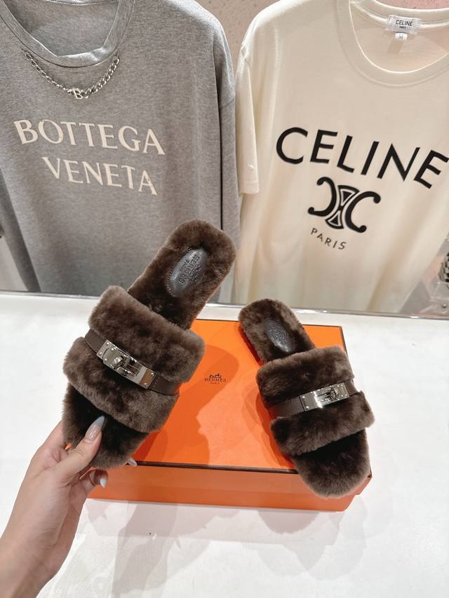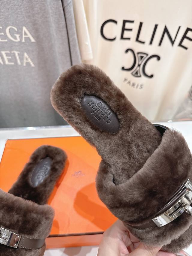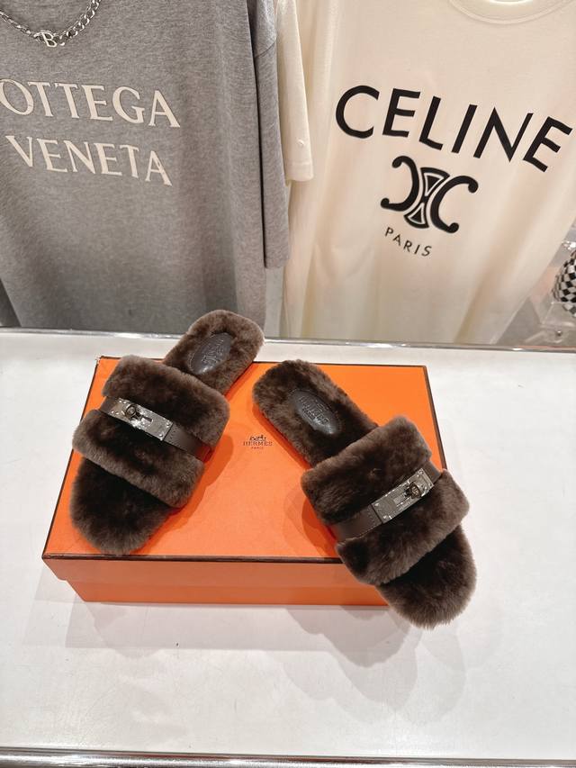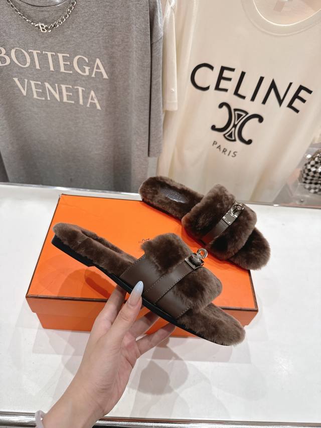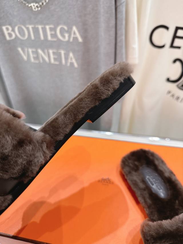 顶级出厂 Hermes* 爱马仕F021 2025Ssh家新款平底毛毛拖鞋 羊羔毛特别柔软~上脚十分显白~软绵绵的~超级舒服~光脚穿、配袜子更是不一样的时髦感~