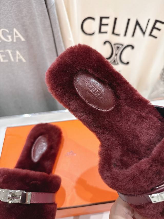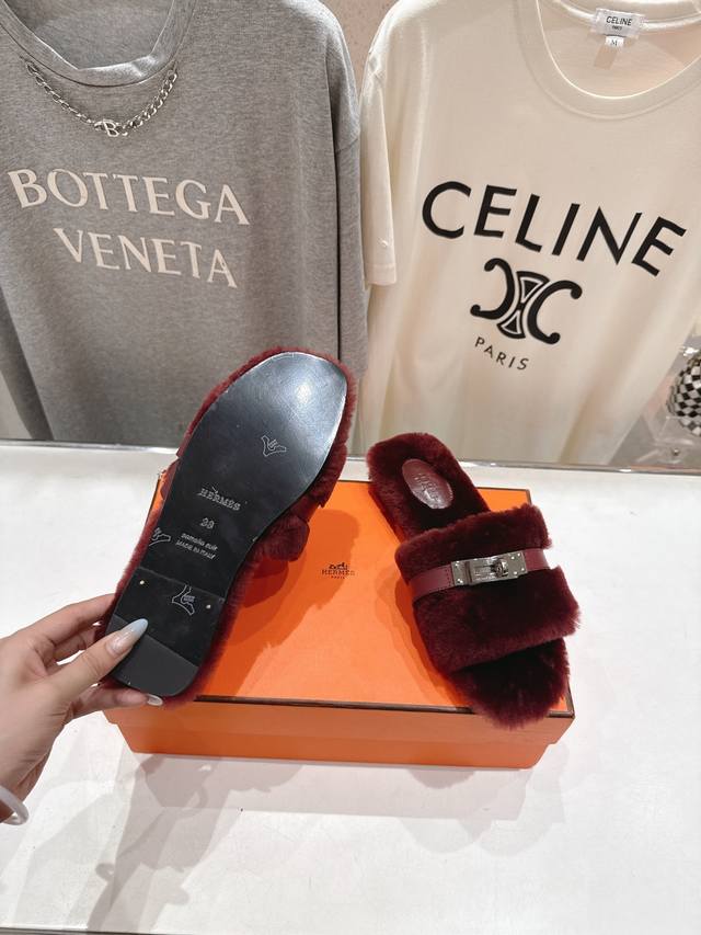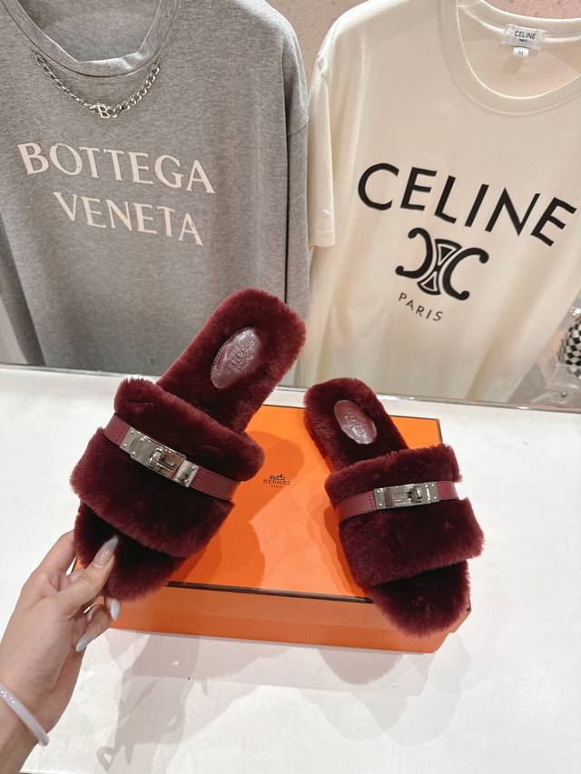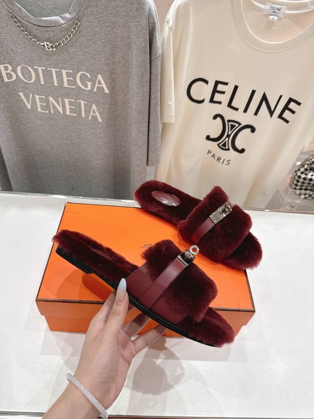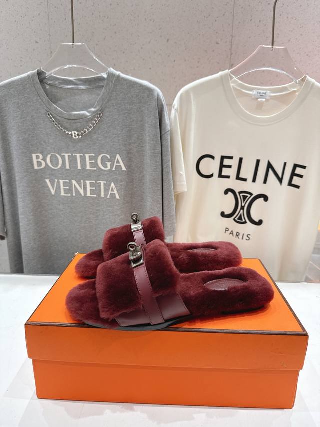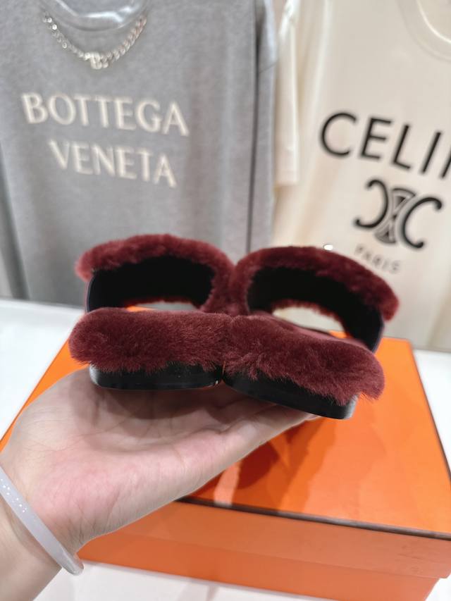 顶级出厂 Hermes* 爱马仕F021 2025Ssh家新款平底毛毛拖鞋 羊羔毛特别柔软~上脚十分显白~软绵绵的~超级舒服~光脚穿、配袜子更是不一样的时髦感~