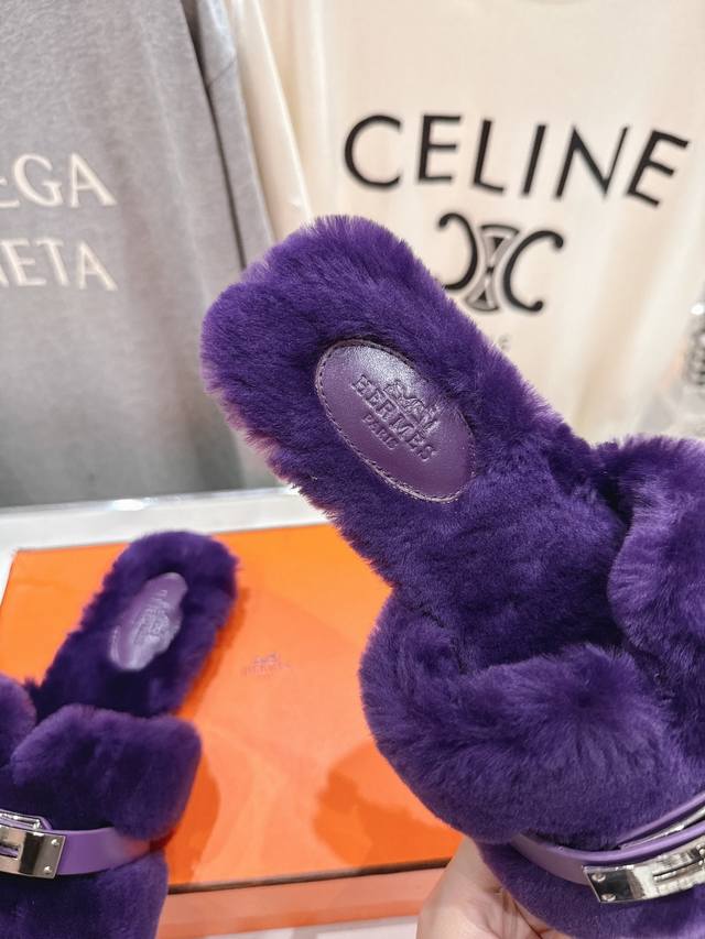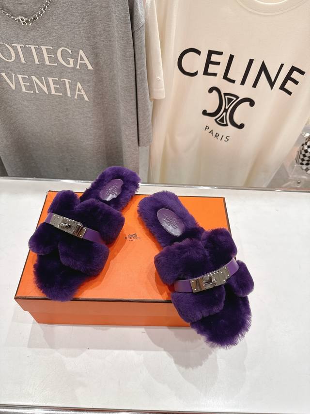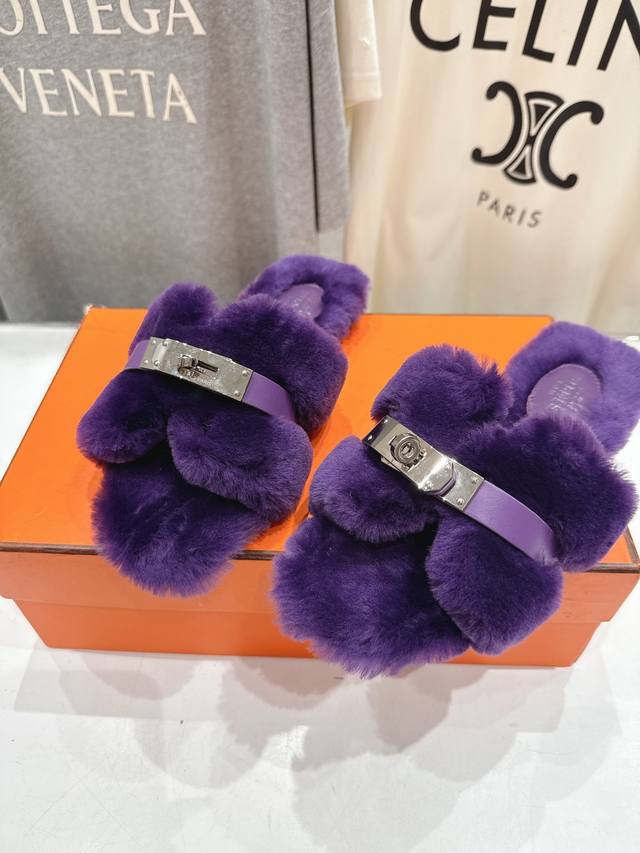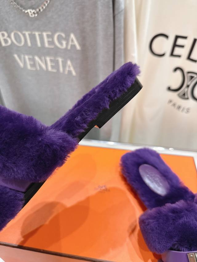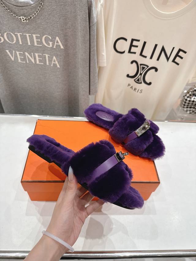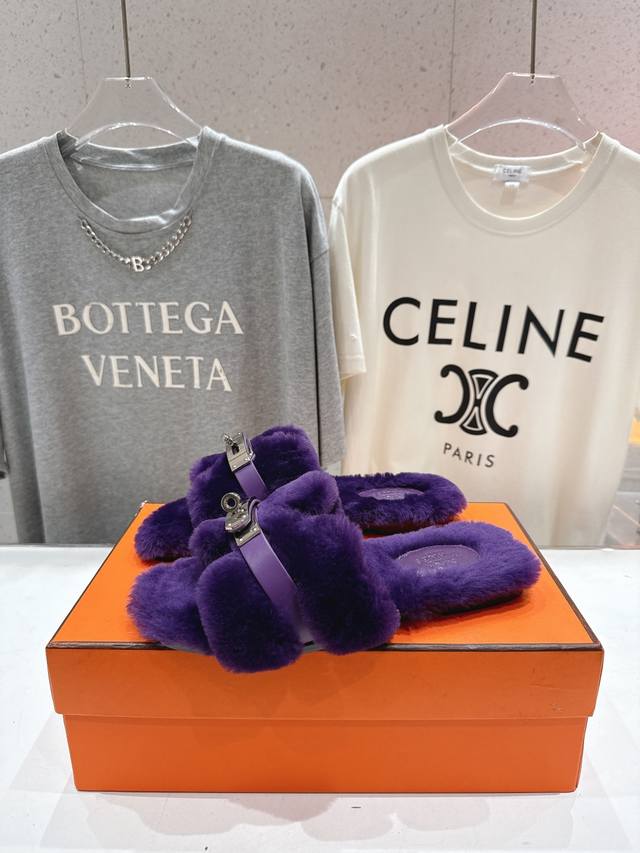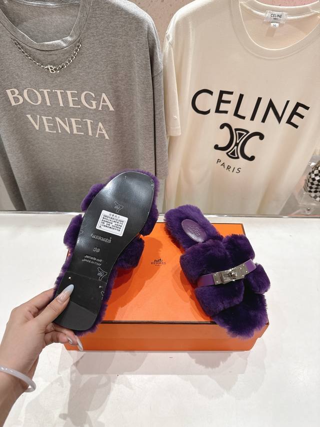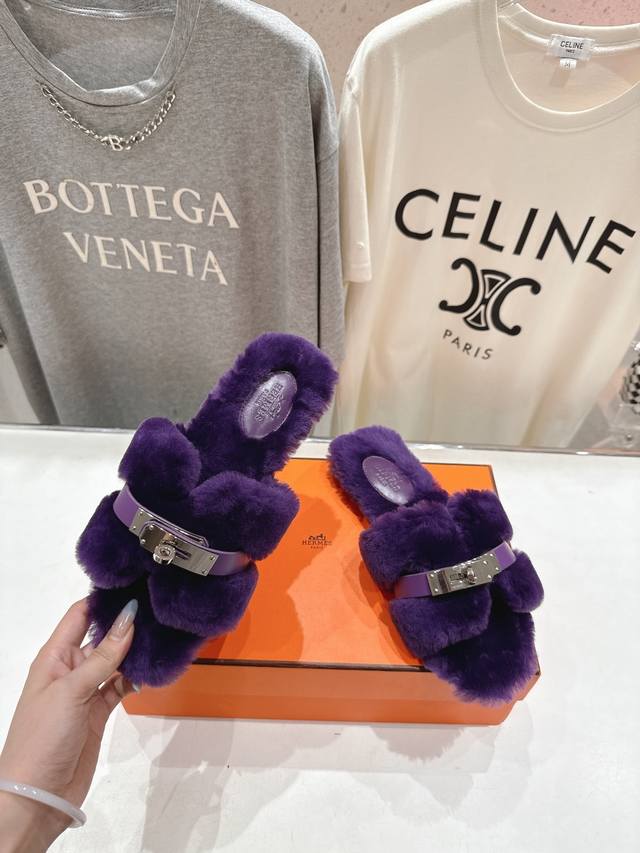 Hermes* 爱马仕F021 2025Ssh家新款平底毛毛拖鞋