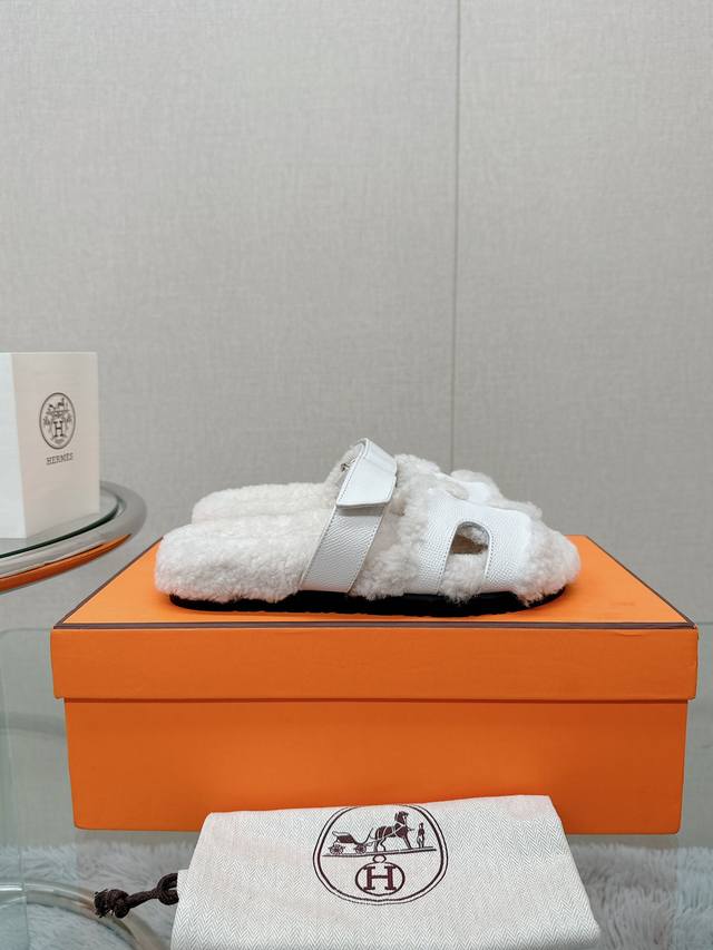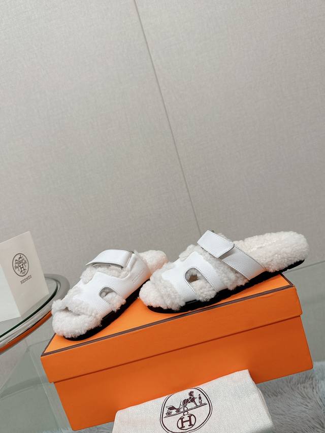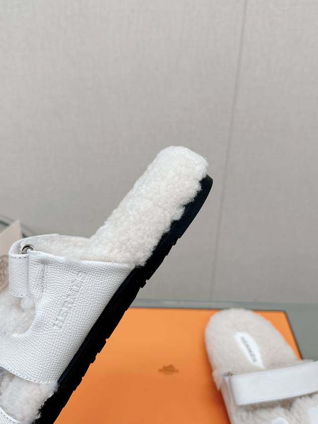 顶级品质Herme* 爱马仕新品皮面毛毛拖鞋,踩在羔羊毛上,舒适度满分,光脚都不觉得冷,配个厚袜子 超美哦!鞋面:羊京 荔枝纹牛皮内里:羊毛 羊皮垫脚鞋底:原版