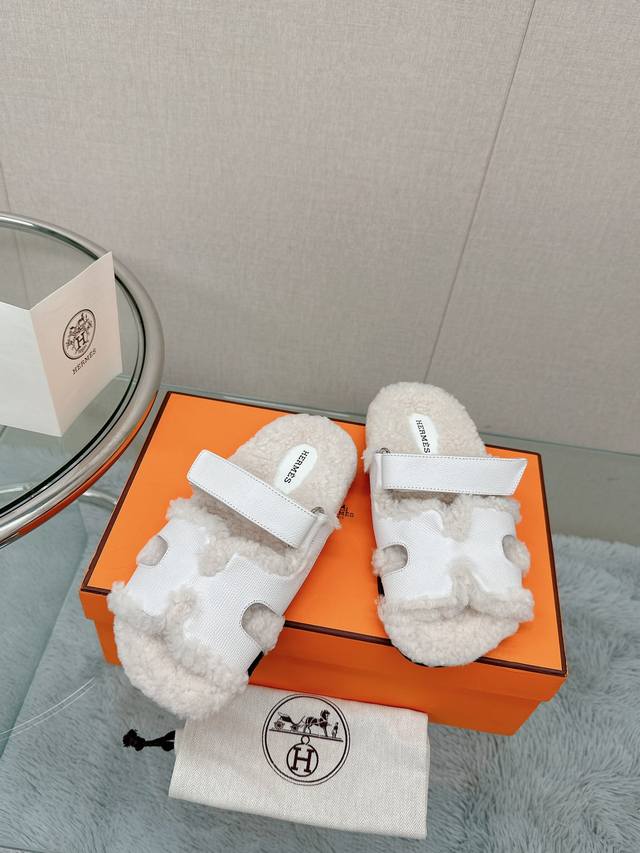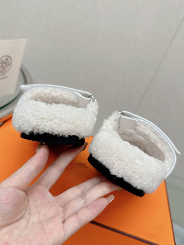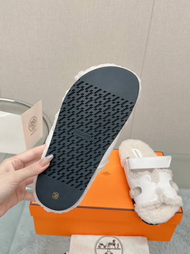 Herme* 爱马仕新品皮面毛毛拖鞋,踩在羔羊毛上,舒适度满分,光脚都不觉得冷,配个厚袜子 超美哦!