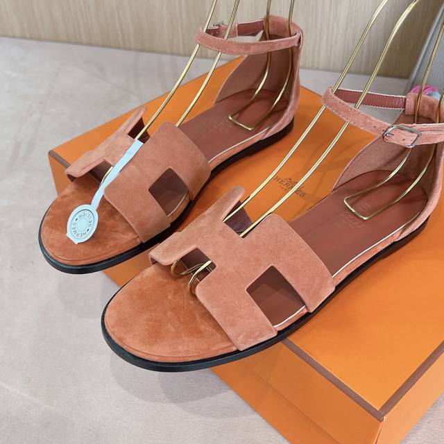 麂皮拼色出厂价420Hermes 经典Santorini 凉鞋 新设计灵感还是遵循传统经典 H 鞋面,搭配精致踝带、可调节系带,适合日常穿着、打造时尚悠闲风格