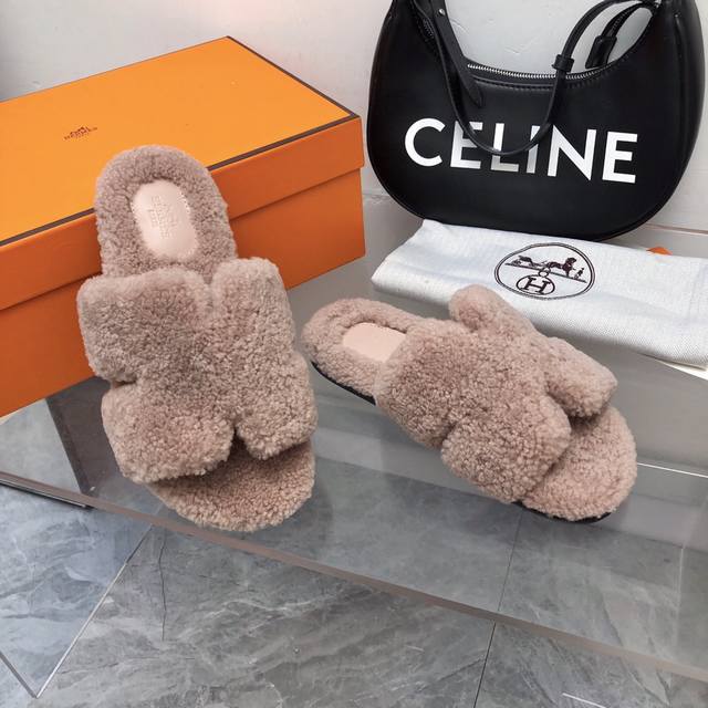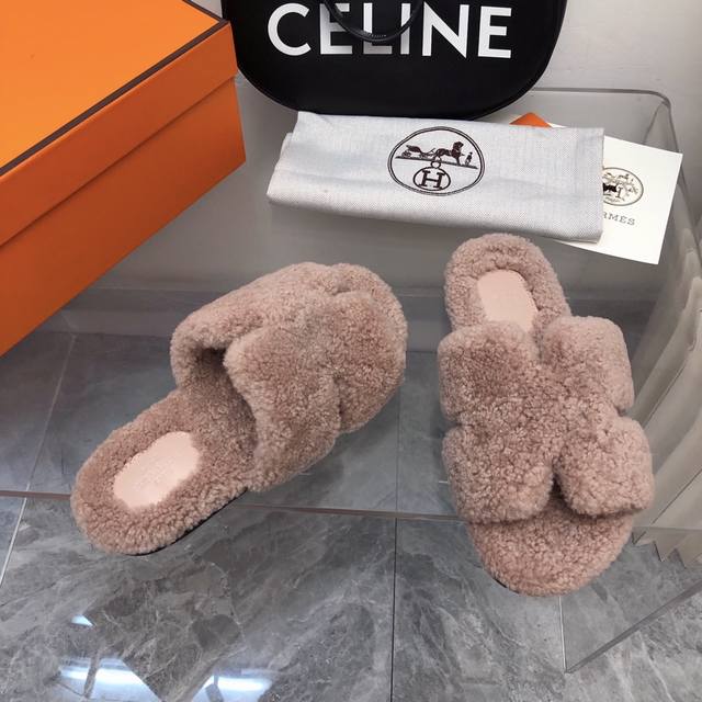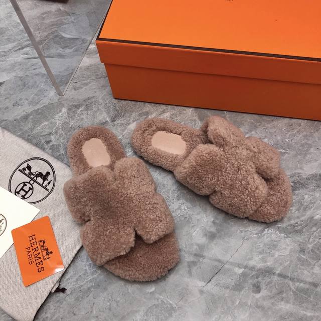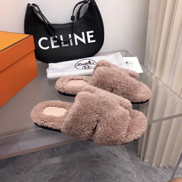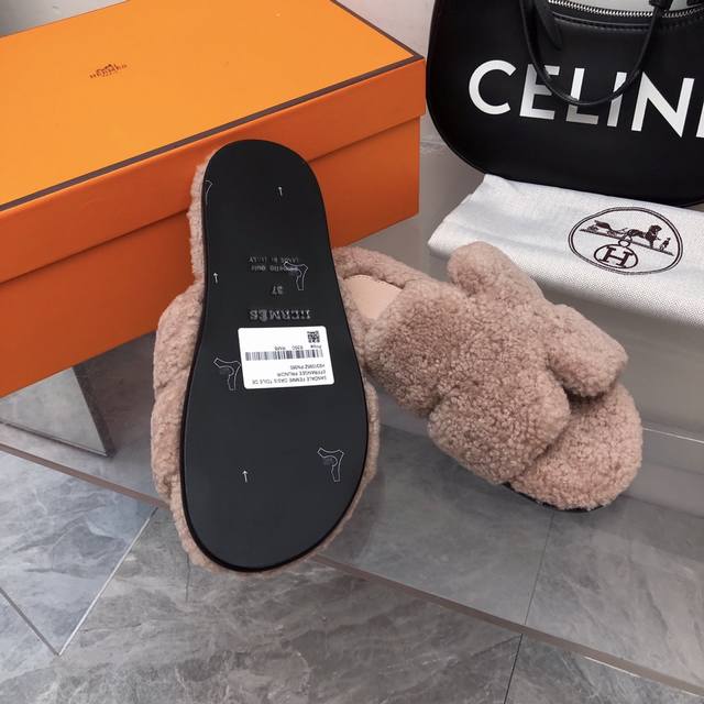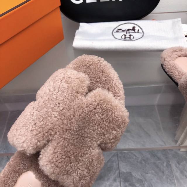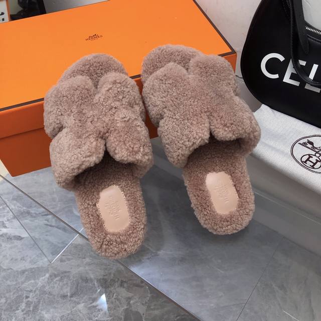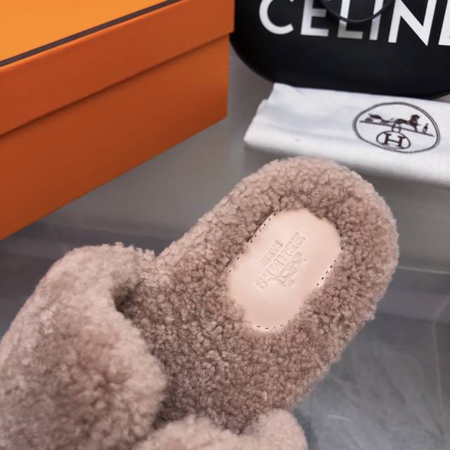 fw25 New Arrival~ H家2025秋冬 情侣款毛拖 皮毛一体卷糕羊毛材质,超Nice 版型是男款H拖衍生过来的,鞋型微宽一点,脚感舒服不止一点点! 双层意大利进口牛皮革鞋底! 顶级精品 情侣Size:35-45 女35-41 男39-45
