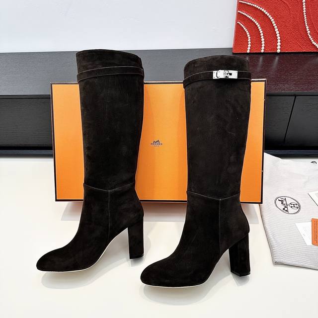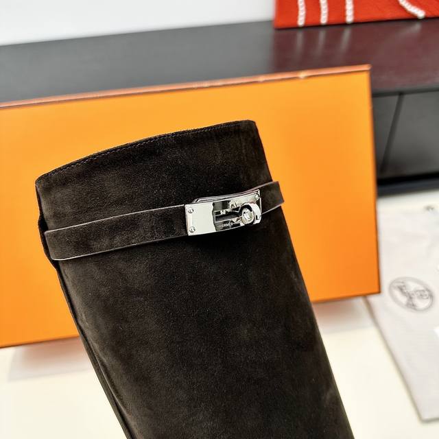 HermèS 爱马仕 H家Kelly扣高跟长靴 圆头粗跟靴子 牛皮 麂皮 真皮底 跟高:6Cm 正码:36-39订做34.40.41.42
