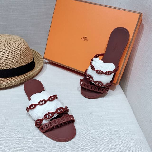 Hermes-爱马仕 三带 七个颜色,每个色都很经典 Pvc国际标准 百搭高颜值拖鞋 非常好看 一年四季都可以穿 放在家里真的很高逼格 出去旅行必备 不占地方关键还好看 百搭好看 搭配任何衣服都可以 一体成型 模具费用超级贵 但是物有所值,最高端的品质 专柜包装,码数:35-40 正常码数