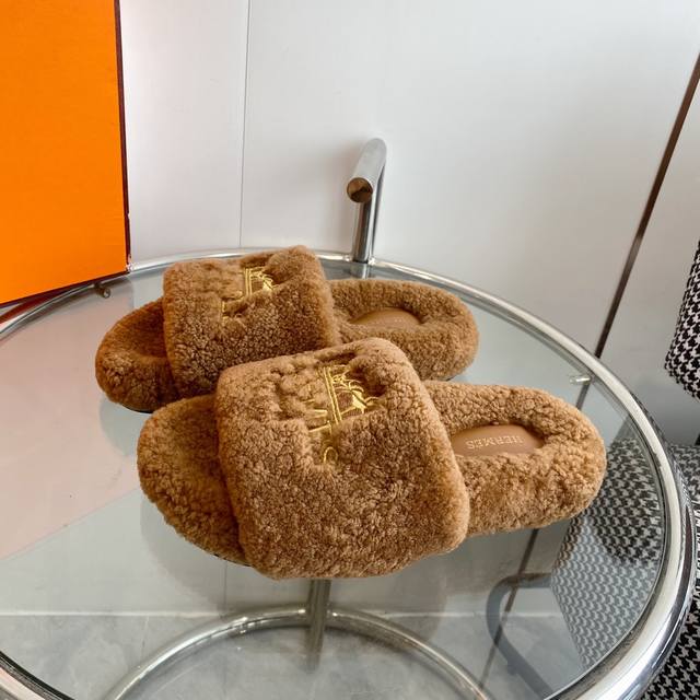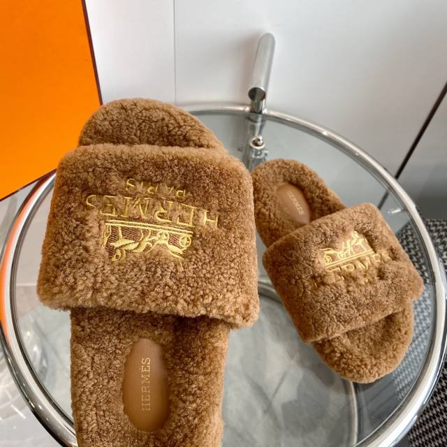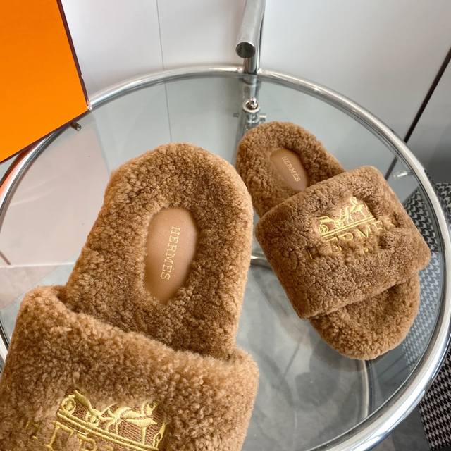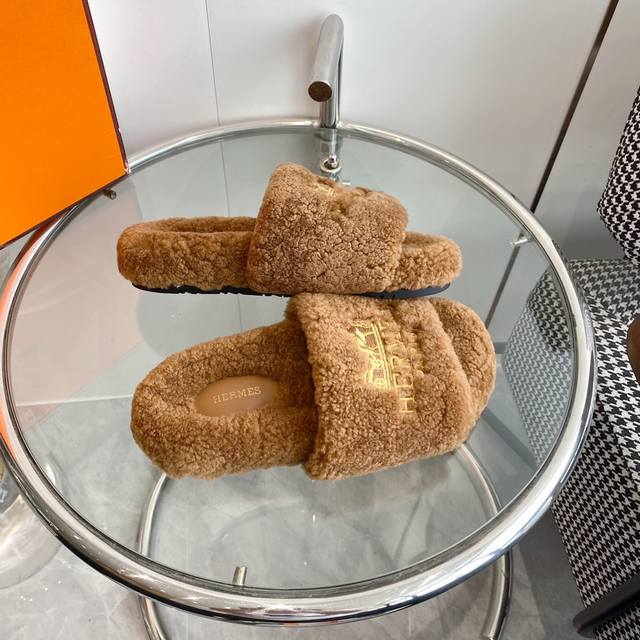 Hermes 爱马仕h家 Oran 系列 泰迪平底毛毛拖鞋 顶级品质 鞋面:原版进口羔羊毛 进口真皮大底 Size:35-39 40.41定做不退换
