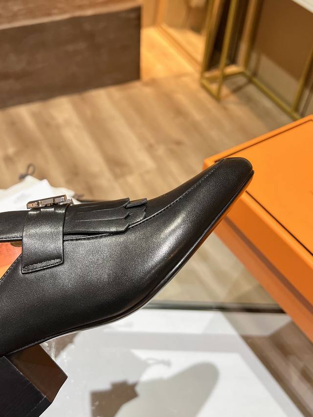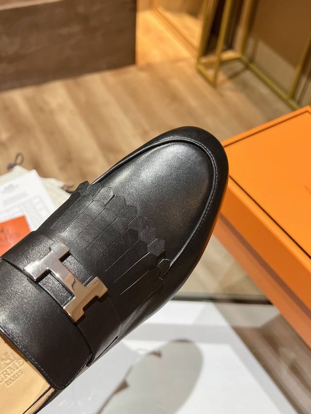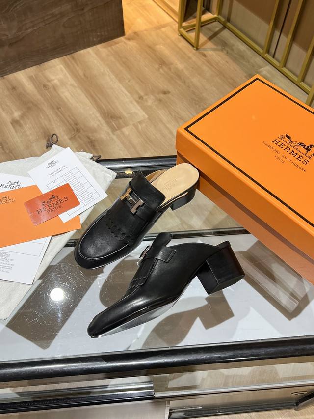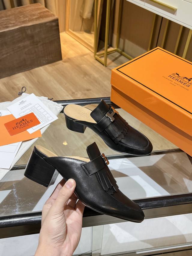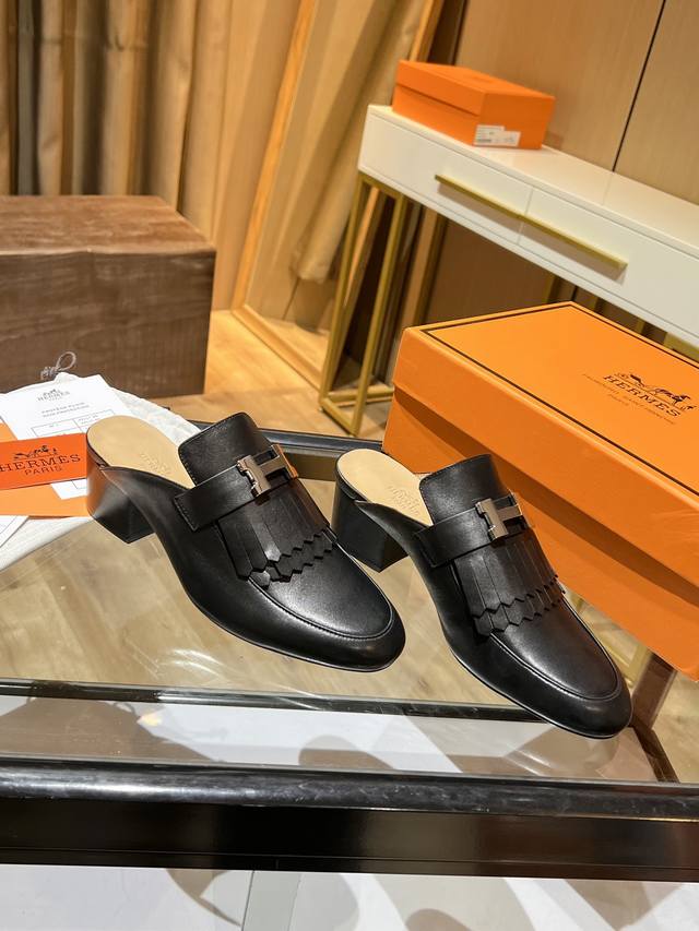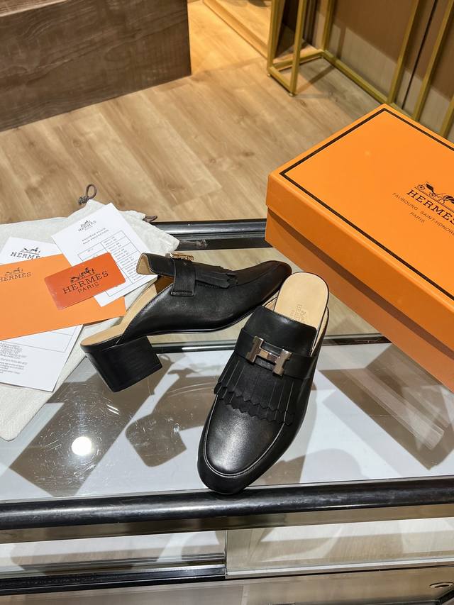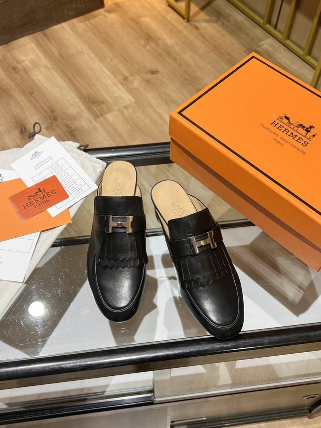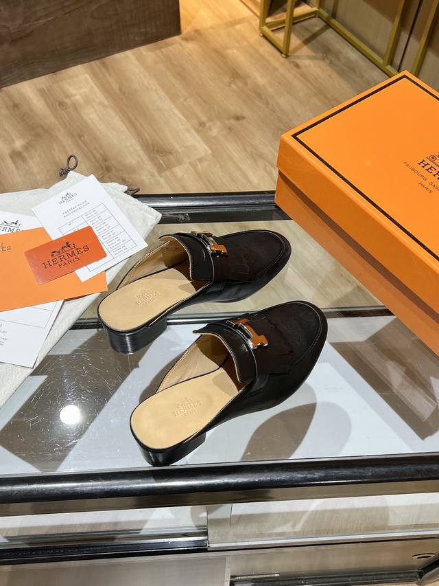 代购级别!HERMES-爱马仕经典H扣流苏款懒人拖 半拖鞋!代购级版本正式上市!慢工出细活!专柜采版1:1复刻,形体、工艺、材质皆以超高标准来要求。材质:面料选用法国山羊皮,私人定制H家皮纹风格!内里1:1定制全粒牛皮里高档且舒适透气。 五金扣:1:1纯钢开模五金。唯一独家市场对版五金 注意H扣螺丝是梅花头 而不是市场普通合金十字头或者是一字头螺丝!真假一看螺丝头就可以分辨了!大底:采用意大利进口真皮大底码数:35-39标准码。34 40 41 可定做不退不换
