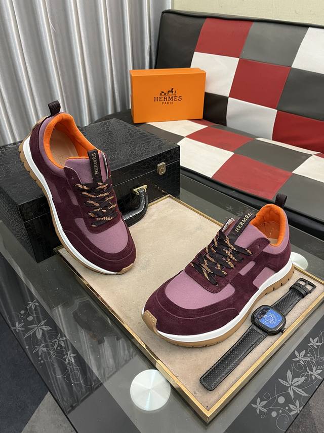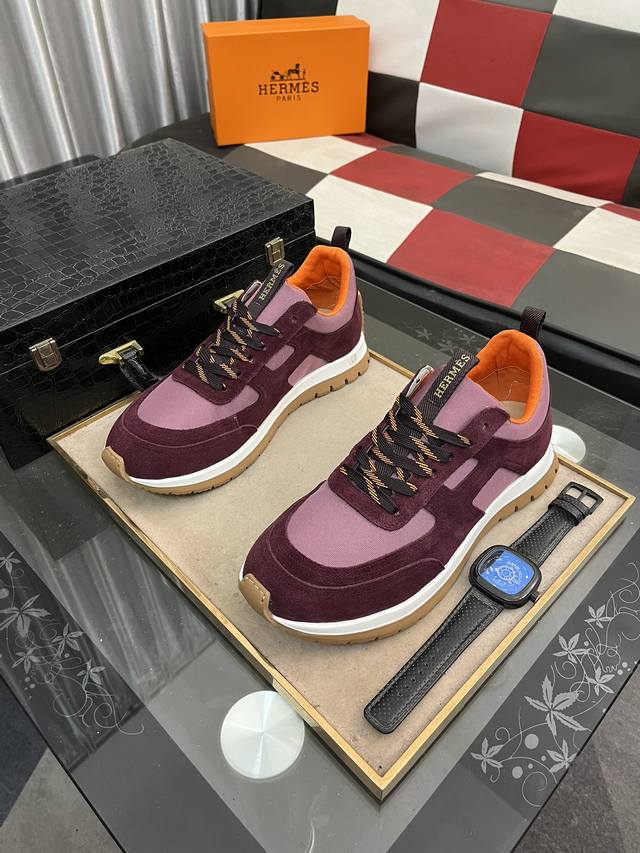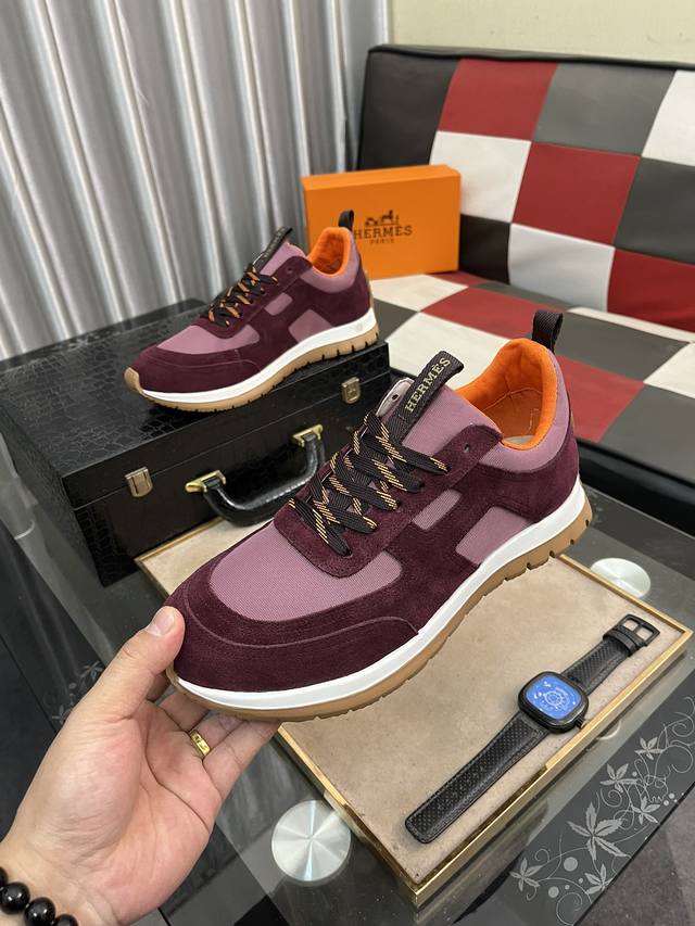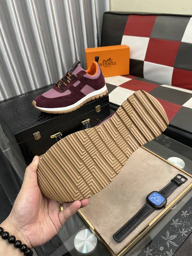 / 出厂价: 高邦 新品专柜同步发售!Her* 爱马仕~高端男士运动休闲鞋!专柜代购原单货!原版进口荔枝纹牛皮撞色设计进口羊皮内里 牛皮垫脚原版双层tpu组合大底!