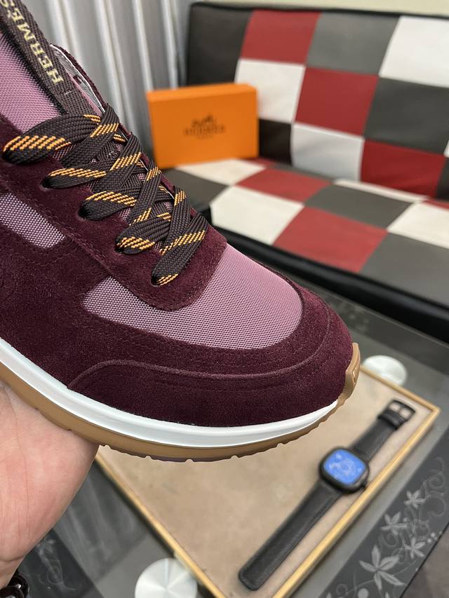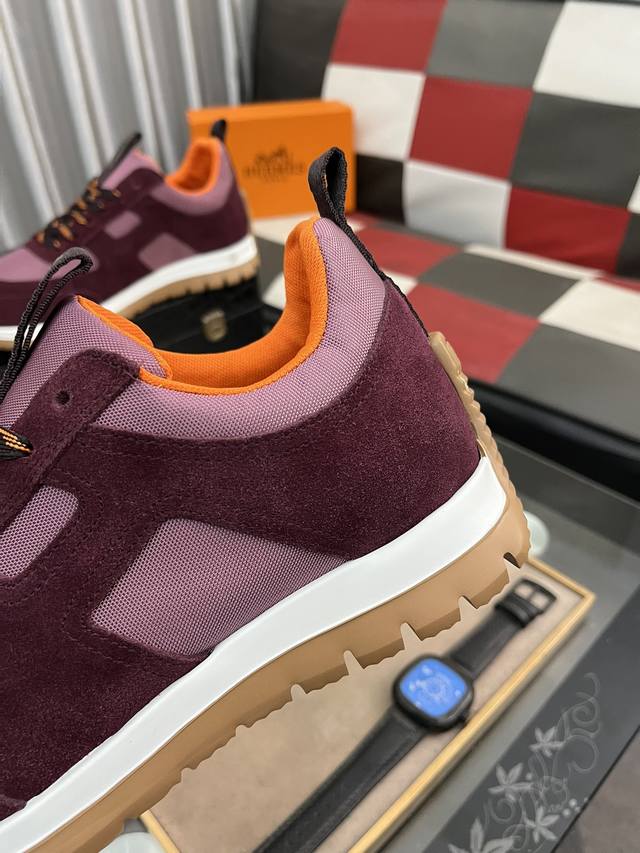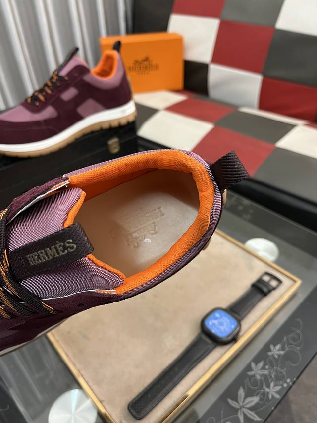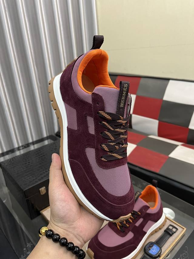 出厂价: 高邦 新品专柜同步发售!Her* 爱马仕~高端男士运动休闲鞋!专柜代购原单货!原版进口荔枝纹牛皮撞色设计进口羊皮内里 牛皮垫脚原版双层tpu组合大底!
