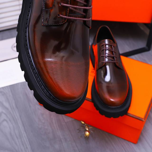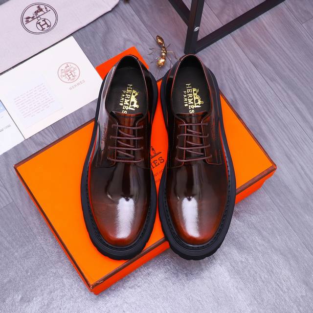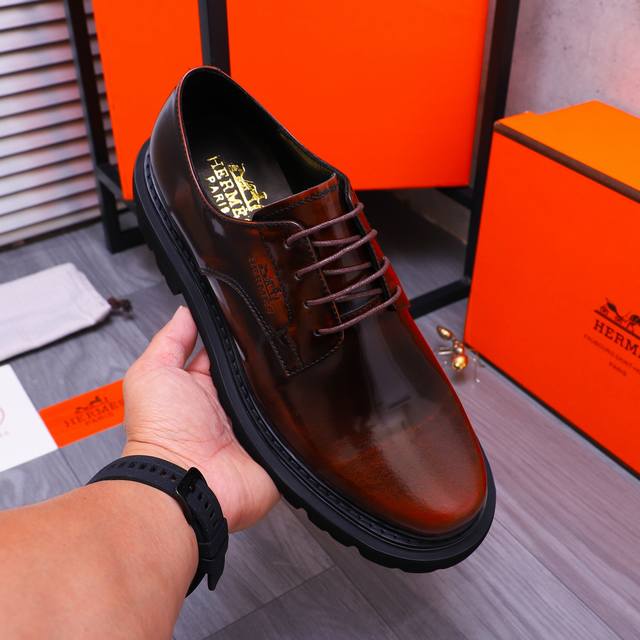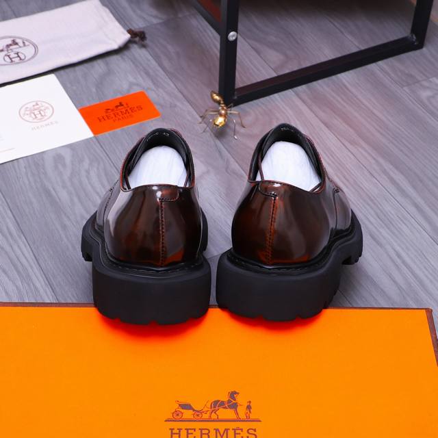 商品商标:Hermes 爱马仕 商务正装皮鞋 正码码数: 38-45 商品材料:精选珠光牛皮鞋面 牛皮内里 原版大底