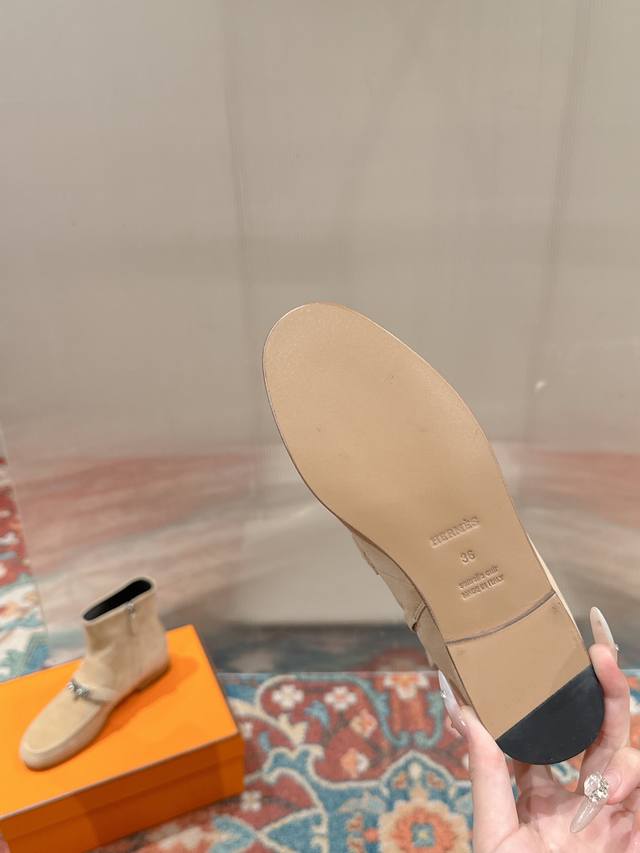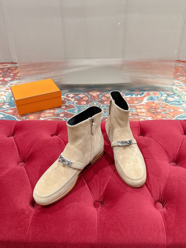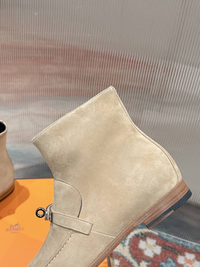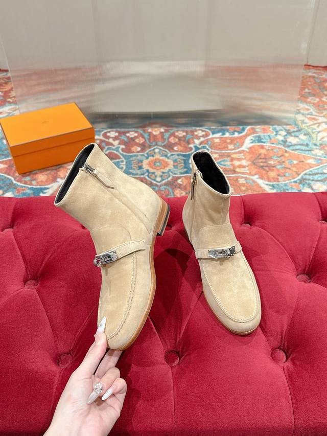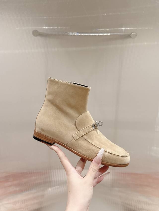 Kelly扣复古平底短靴它传承爱马仕百年匠心工艺 每一处细节都彰显非凡品质标志性Kelly扣点缀于靴面 闪耀金属光泽流畅线条 精致尽显奢华质感 延续经典传奇 是爱马仕品味象征 无论是都市街道还是户外漫步都稳健自在靴筒高度恰到好处 贴合脚踝修饰腿部线条 显腿瘦显腿长搭配牛仔裤 干练随性;搭配连衣裙 优雅迷人轻松适配风格服装 四季百搭时尚单品。