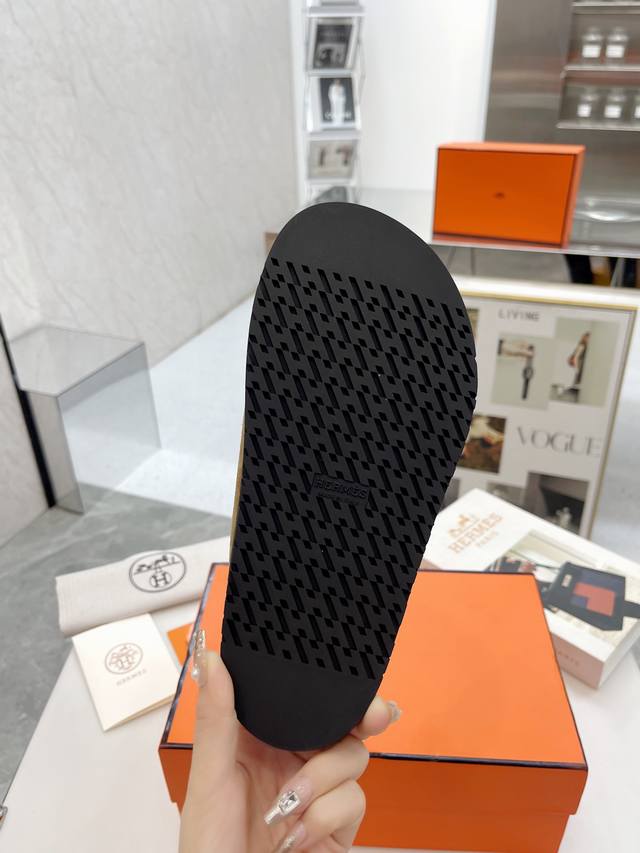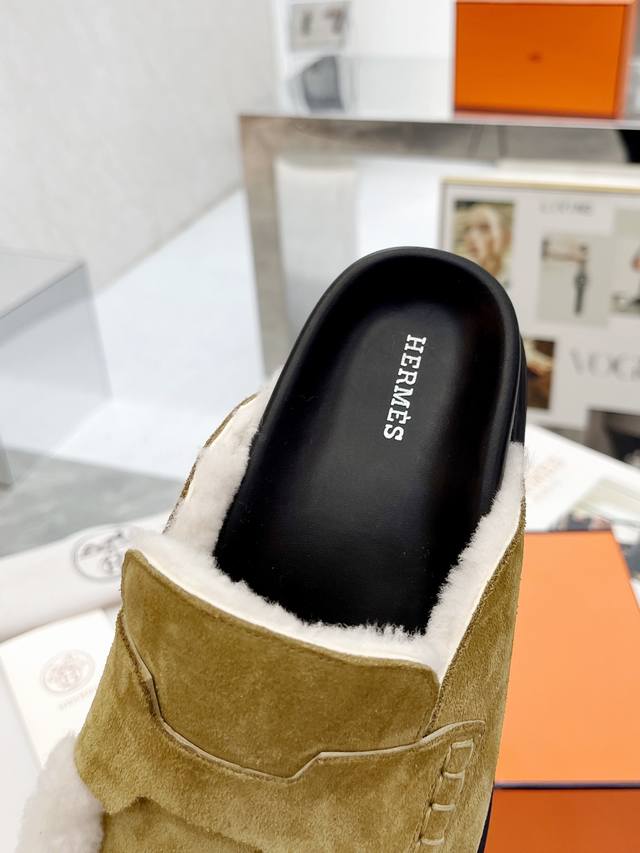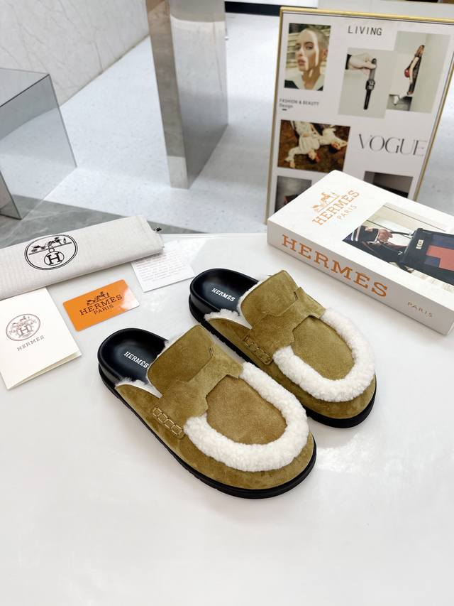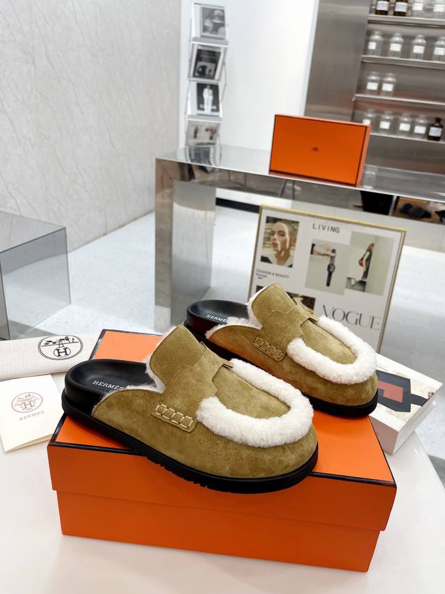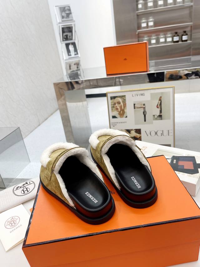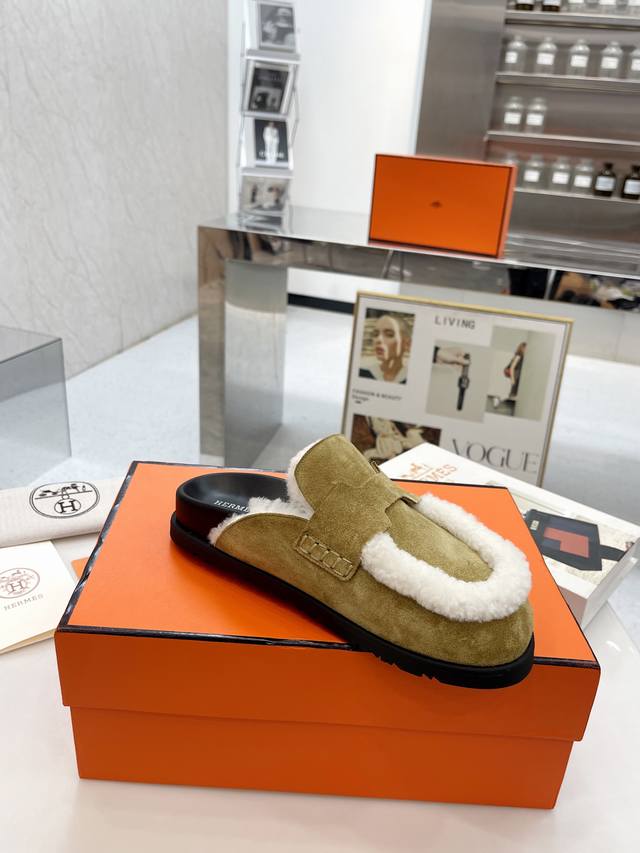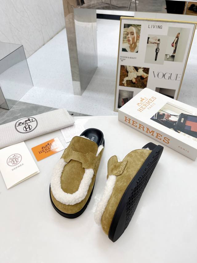 爱马仕 勃肯毛毛半拖鞋 毛毛萌萌可爱 上脚舒适时尚,原版开发,真皮面料,羊毛里,TPU大底,码数5-40