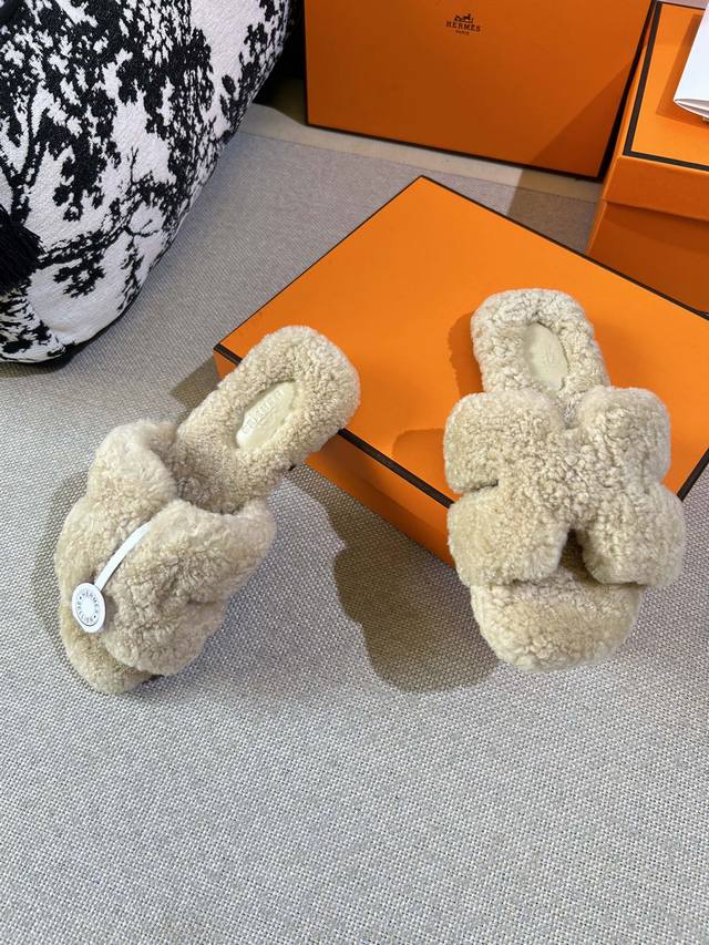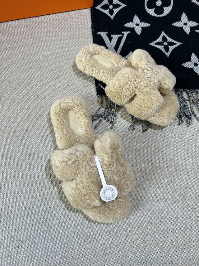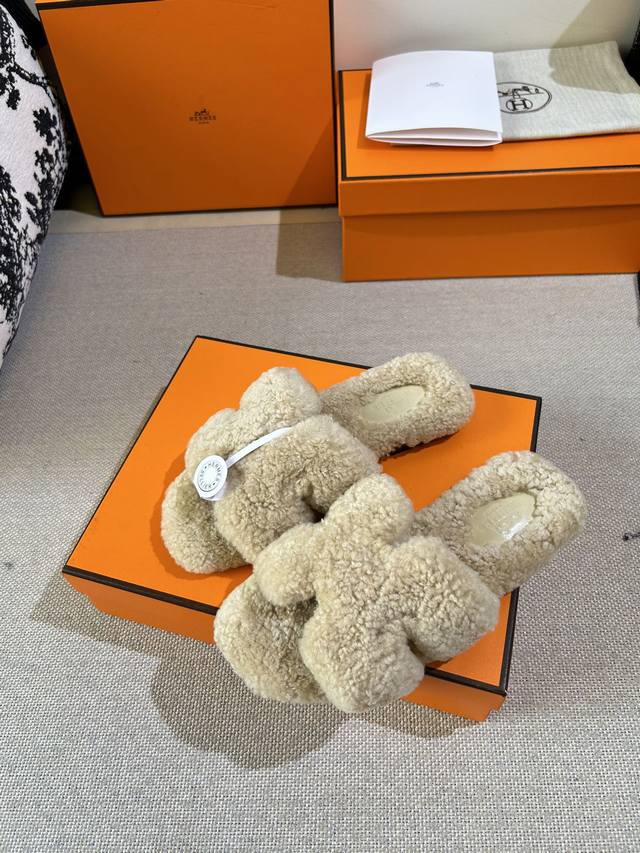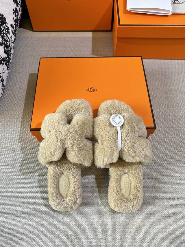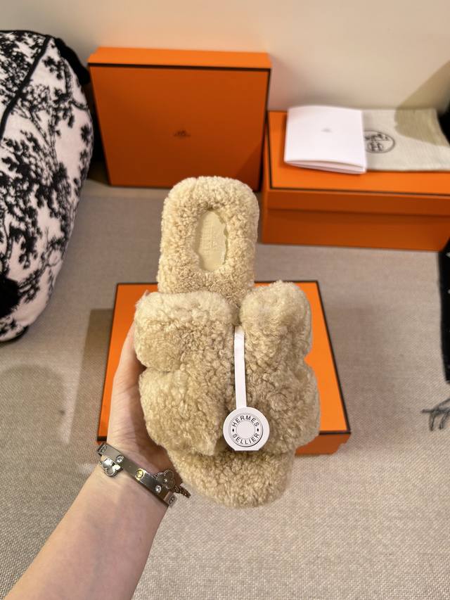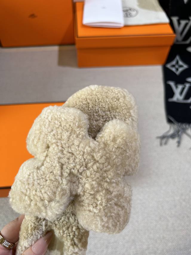 H家高品质毛毛拖鞋 herme*时尚潮流最新款泰迪羊毛拖鞋 秋冬款平底毛毛拖,上脚超百搭暖底,女主们的最爱 面料采用兔毛 里料 垫脚均是兔毛 大底:真皮大底 s
