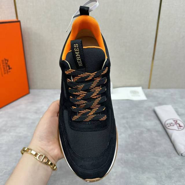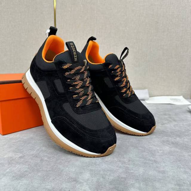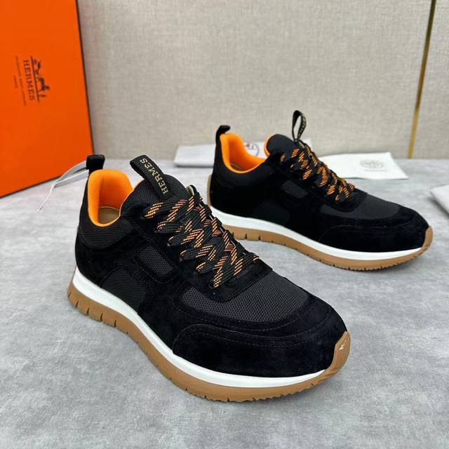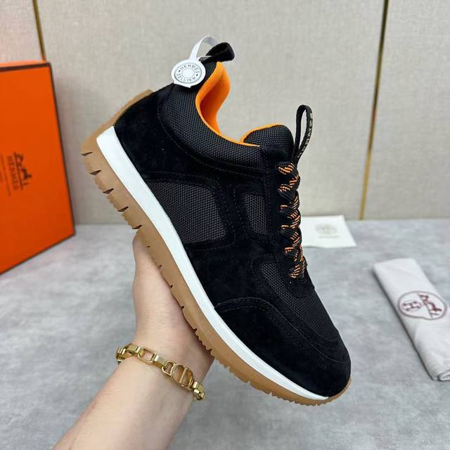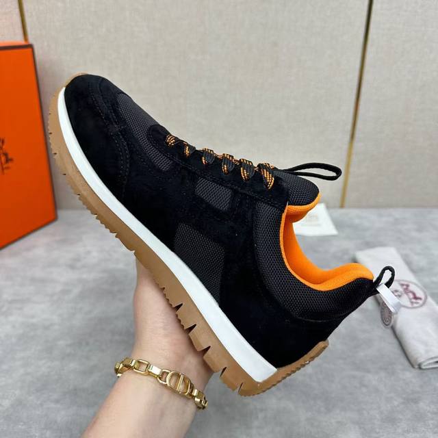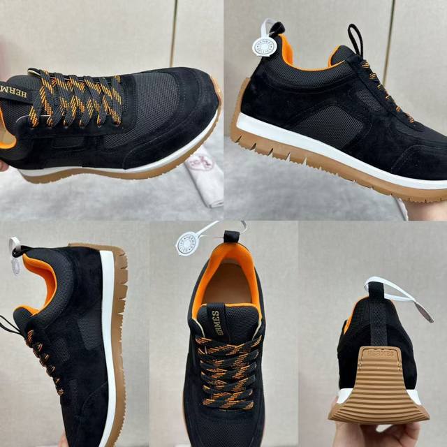 H家 Herme* 爱马-仕 新品上架 Jimmy运动鞋系列 官方售价 Rmb ,250 采用进口牛反绒撞色同色系高科技帆布拼接 双织带提环设计 鞋舌处饰以品牌 Logo 织带提鞋环 配以双色鞋带加持 对比色车线线条流畅 南瓜色高科技帆布内衬 呼应整体色系搭配 自然色牛皮内底 白色橡胶中底组合搭配凹槽蜂蜜色橡胶鞋底 打造现代徒步风格 六色选!原包装发售!