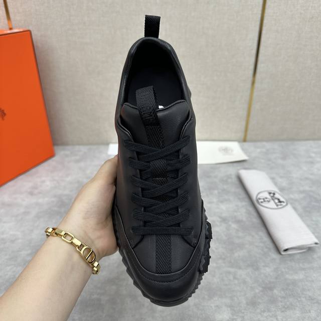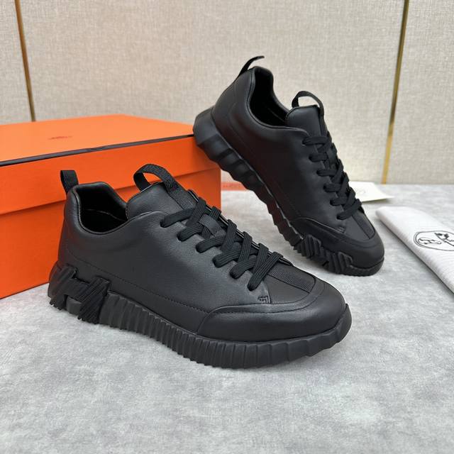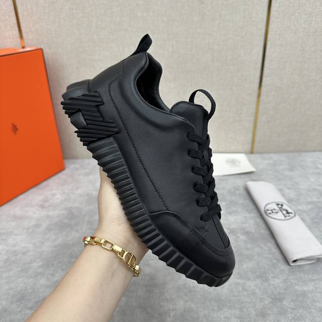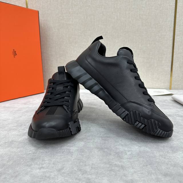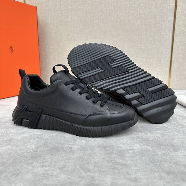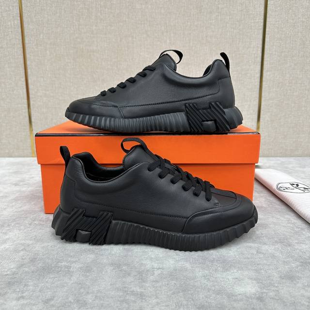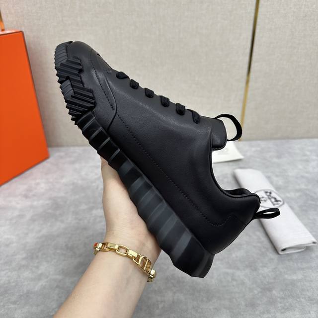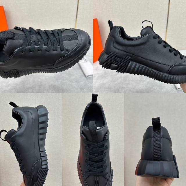 H家 Herme* 爱马-仕 新品 Jump运动鞋 系列 官方售价RMB p9,500 此款面料采运进口小牛皮材质拼接撞色制成,饰有黑色织带贯穿鞋舌形成织带提环与后跟织带提环相呼应。鞋头折边车线线条流程 鞋口周圈饰以泡沫棉加持 舒适度极好 鞋底的对比色H立体浮雕几何图案是整体造型的点睛之处 轻质EVA橡胶鞋底装饰撞色超大号几何 H 图案,拉邦套楦做法 牛皮乳胶回弹垫脚 打造非常轻盈活力时尚现代风格!五色选!原包装发售!