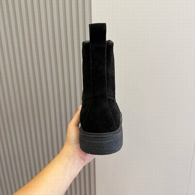 反绒小牛皮及裸靴,搭配功能性镀钯kelly鞋扣和凹槽鞋底。打造不羁的风格