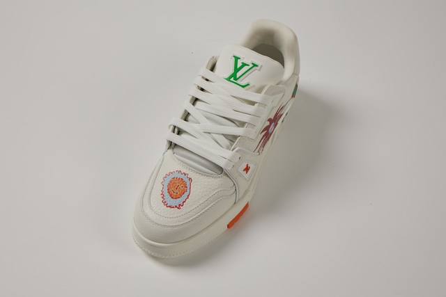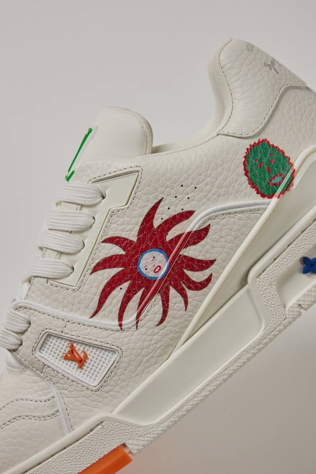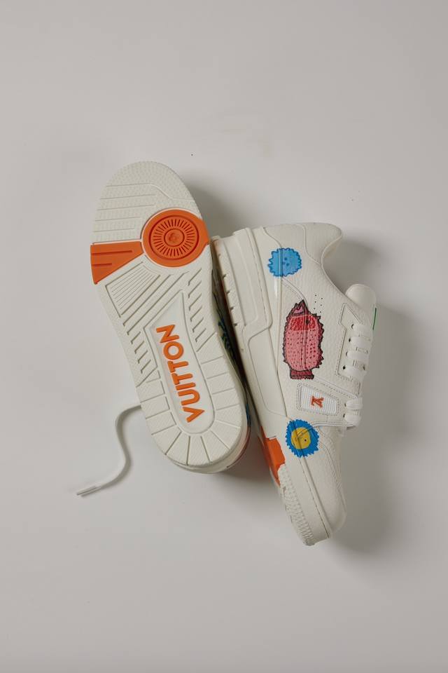 主要以手绘涂鸦和南瓜为主 粒面牛皮革描绘绚烂面孔印花 鞋后标注路易威登联名草间弥生的合作标识