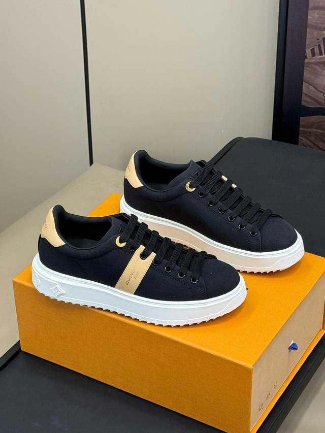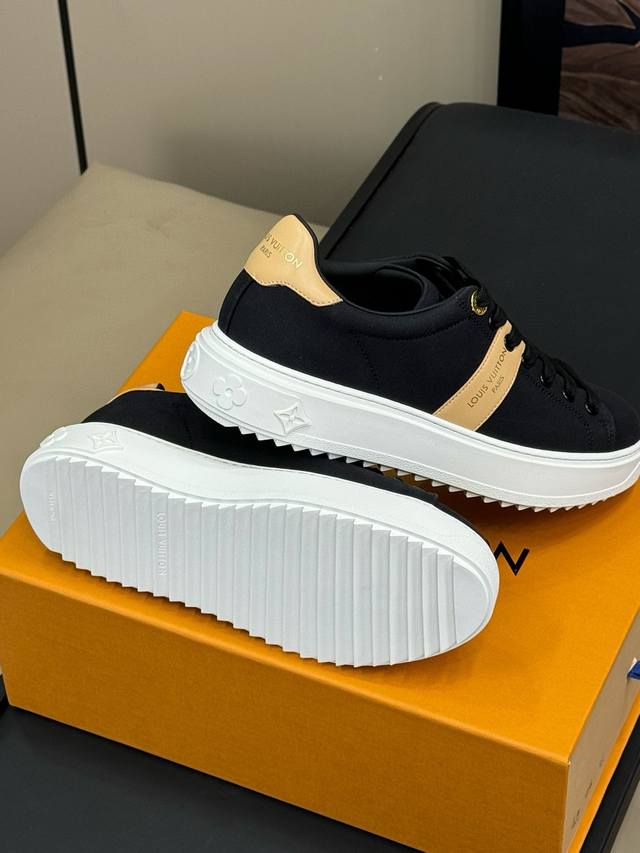原版购入开发 做货 本款 Lv Groovy Platform 运动鞋为牛皮革局部压印 Monogram 图案,并拼接七十年代鞋面与大号橡胶外底。鞋带装饰和外底绽放 Monogram 花卉,别致路易威登标识栖身鞋舌