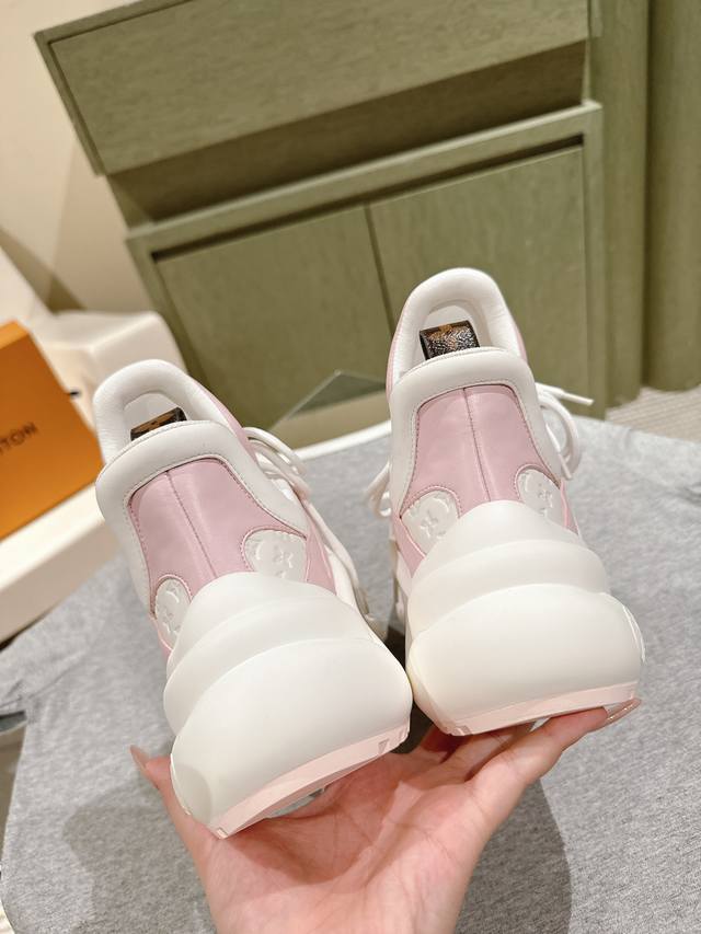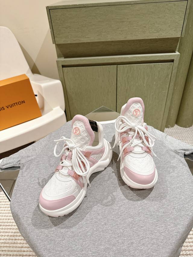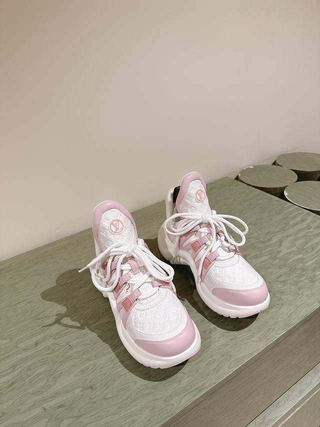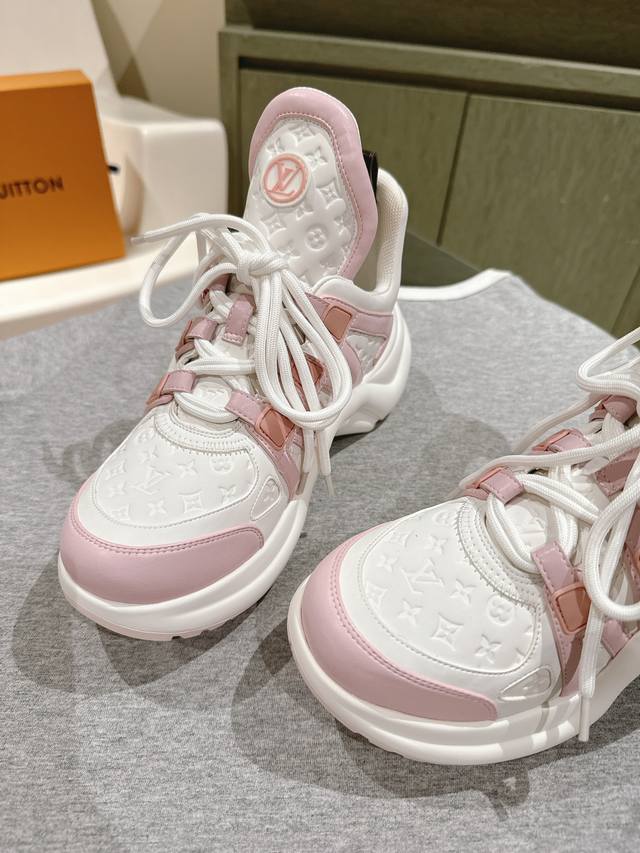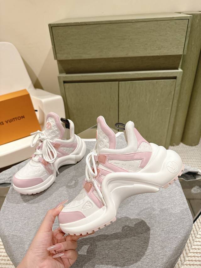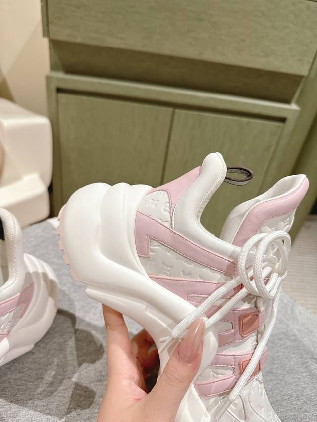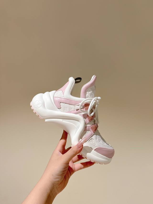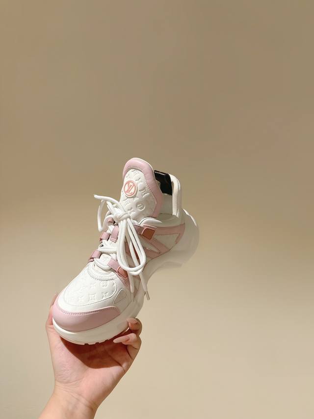 Lv Archlight系列新款拱桥老爹鞋 迪丽热巴 钟楚曦 宋妍霏都是老爹鞋的忠实粉丝 ~早春新品系列加入了更多配色细节,少女心爆棚!尽显青春活力,日常穿搭超级抢眼。新增网面,实在太好看!美到移不开眼!经典的拱形设计,一向被称之为美腿神器!绝对的人手必备 鞋面:原版一致牛皮,耐穿耐磨 大底:原版开模tpu,减震耐磨,回弹力超好,上脚巨显瘦。轻盈舒适!增高5Cm Size:35-40 全套包装 40码定制不退不换