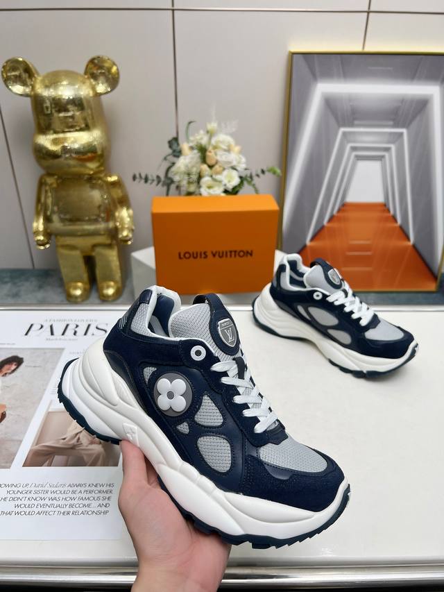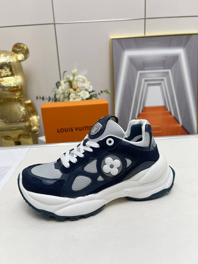冲量价: 官网专柜1比1制作,Lv路易威登run 55 运动鞋拼合网格面料、橡胶和粘胶等科技材质,搭配牛皮革材质,共同洋溢运动格调。Monogram 帆布后袢带