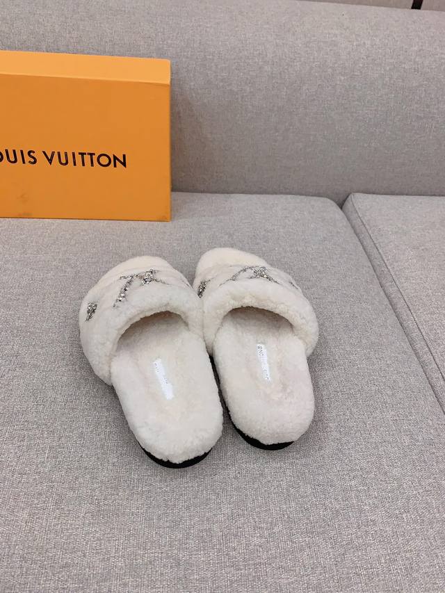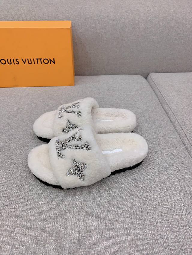 Louis Vuitto*新款泰迪毛毛拖鞋 超闪水钻logo点缀精致无比 超级厚实的澳洲进口羊毛 犹如踩在云朵般的感觉 拉长腿部线条