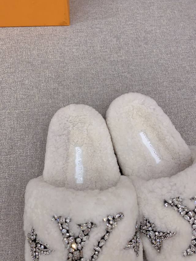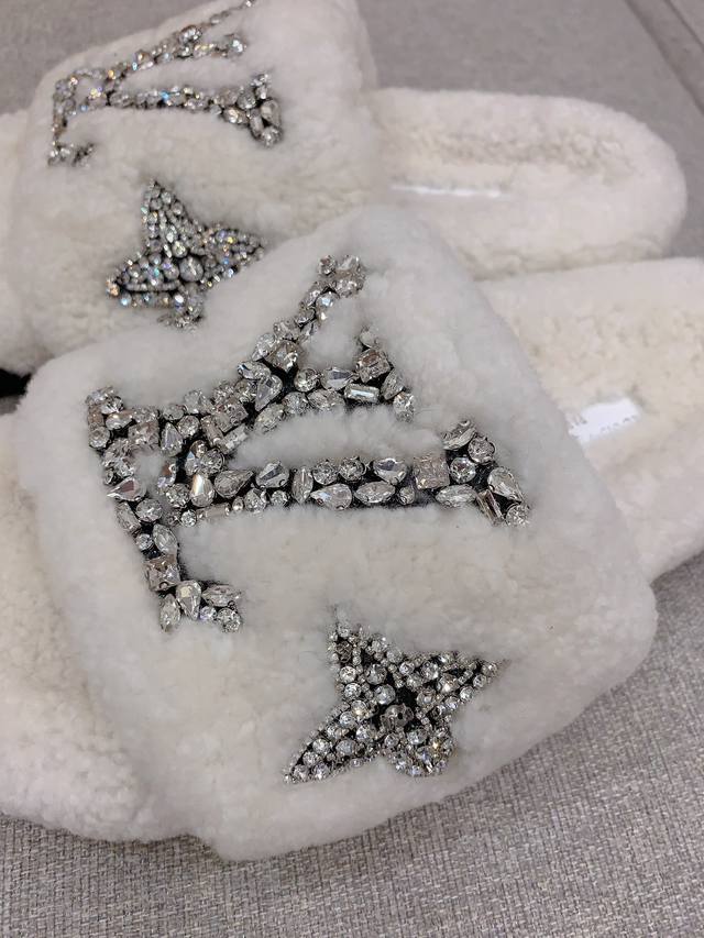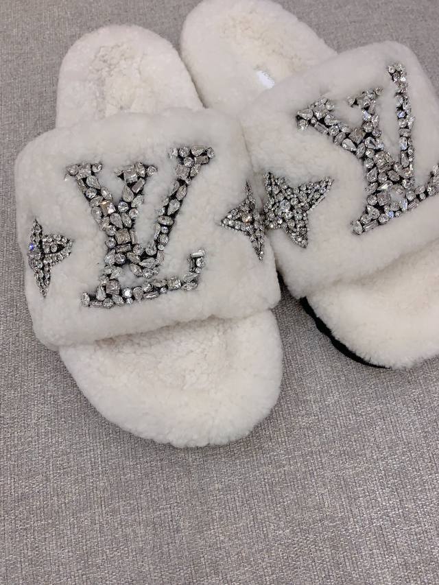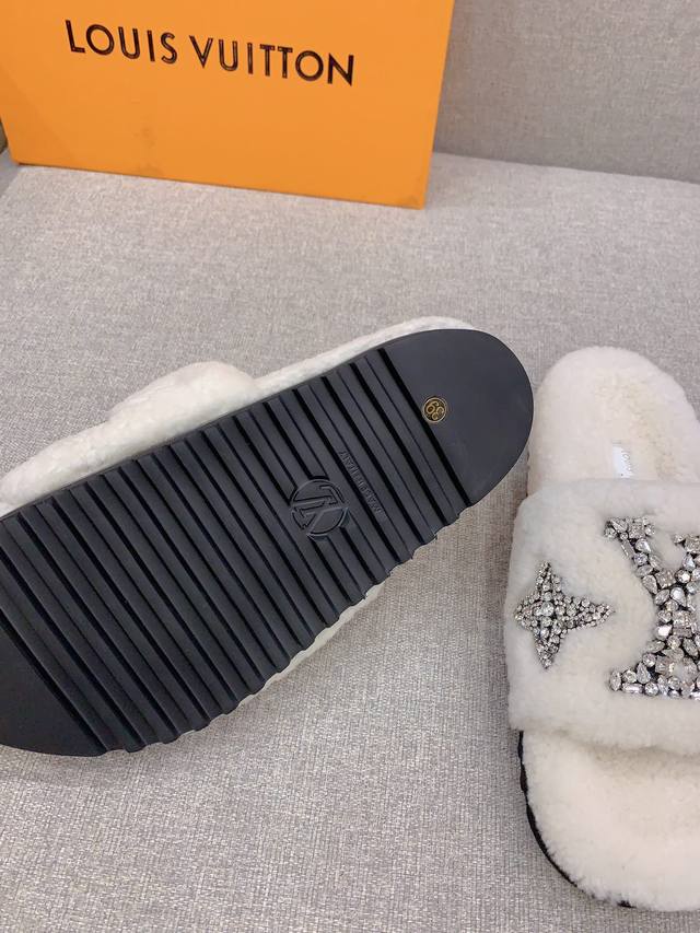 / 出厂价 Louis Vuitto*新款泰迪毛毛拖鞋 超闪水钻logo点缀精致无比 超级厚实的澳洲进口羊毛 犹如踩在云朵般的感觉 拉长腿部线条 面料进口澳洲羊毛