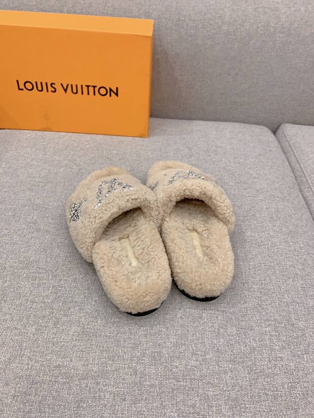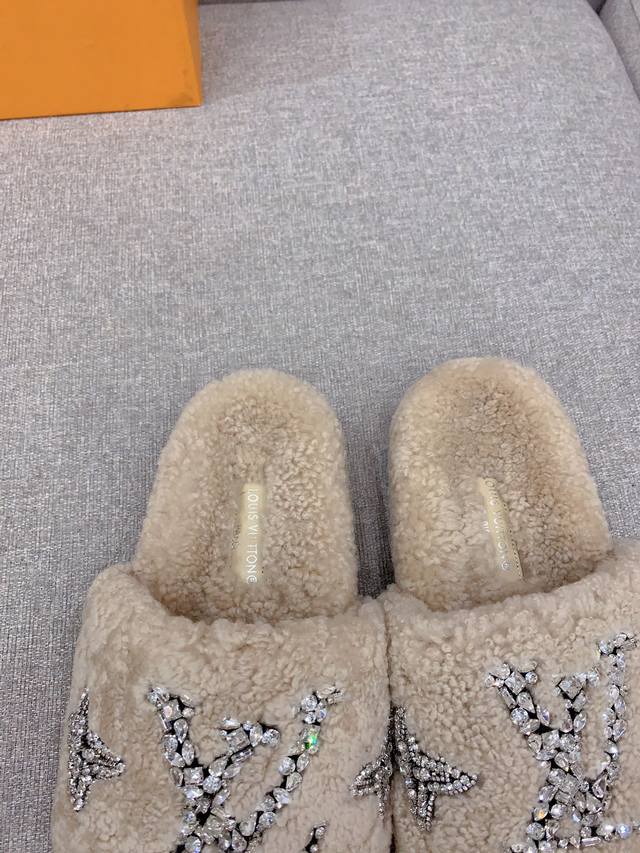 出厂价 Louis Vuitto*新款泰迪毛毛拖鞋 超闪水钻logo点缀精致无比 超级厚实的澳洲进口羊毛 犹如踩在云朵般的感觉 拉长腿部线条 面料进口澳洲羊毛