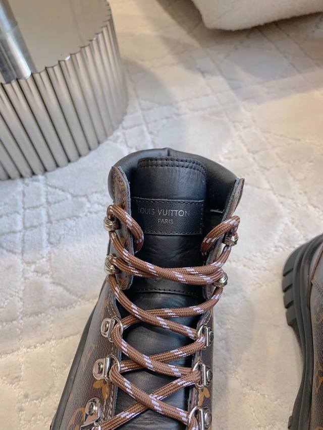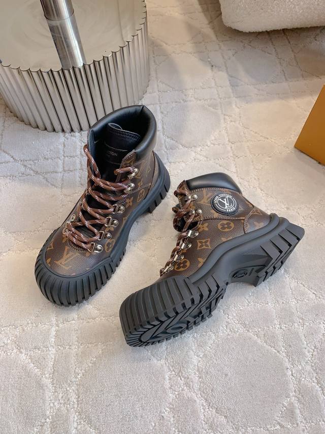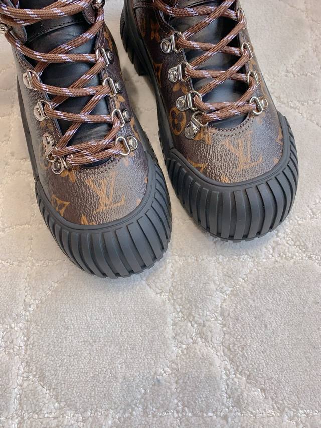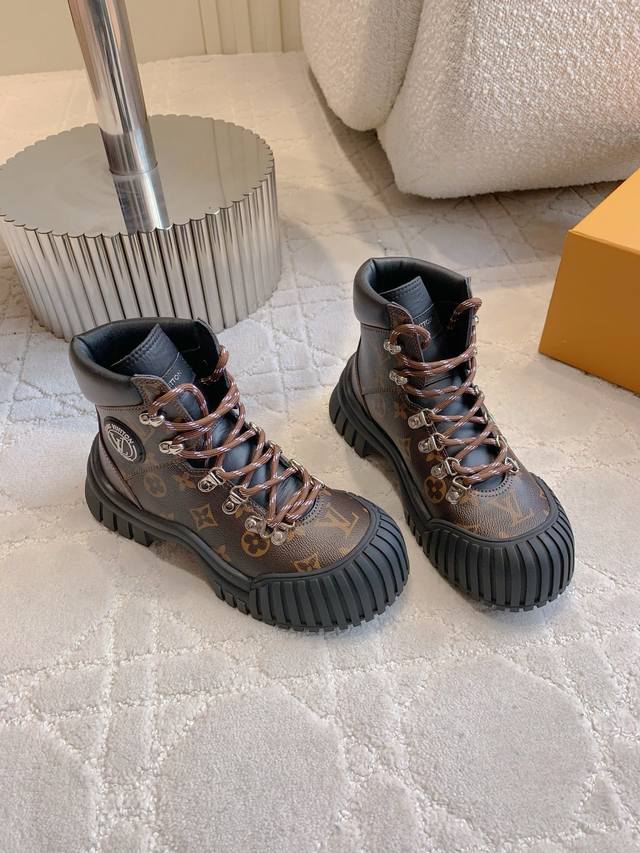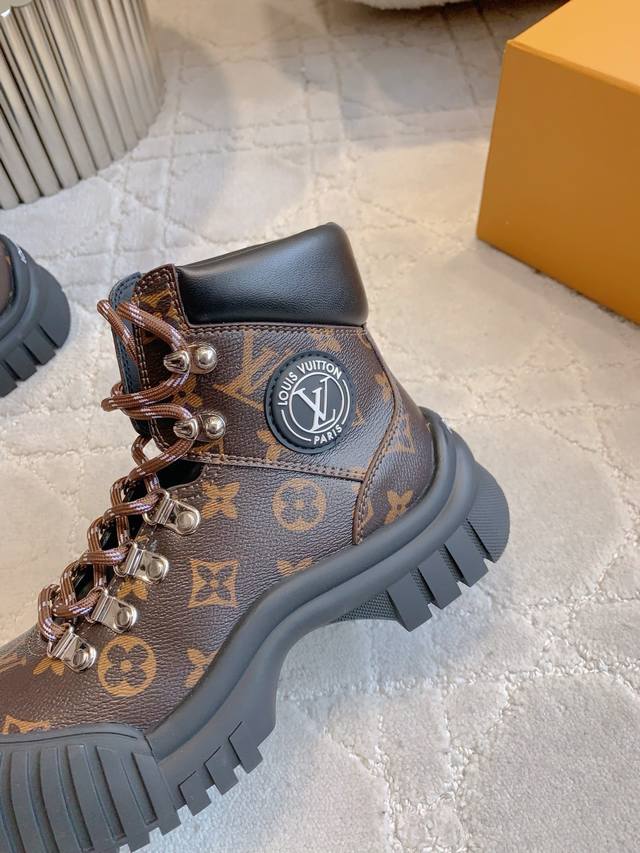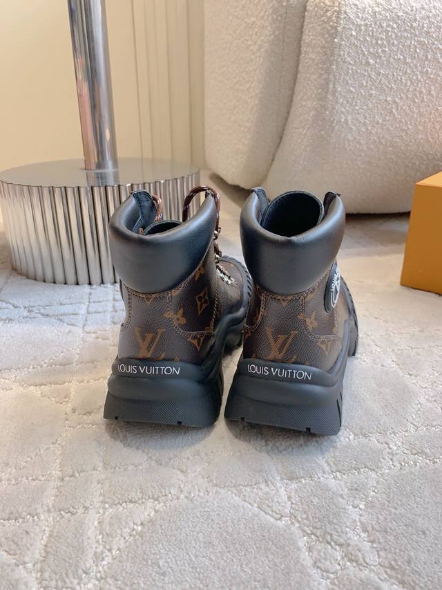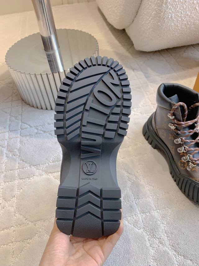 出厂价p Louis Vuitt*经典贝壳头短靴 鞋型酷酷的样子中带点俏皮可爱 很好搭配,脚感好!增高效果也不错呀! 鞋面牛皮 原版老花面料 内里羊皮 原版开模