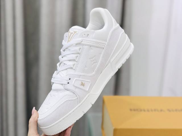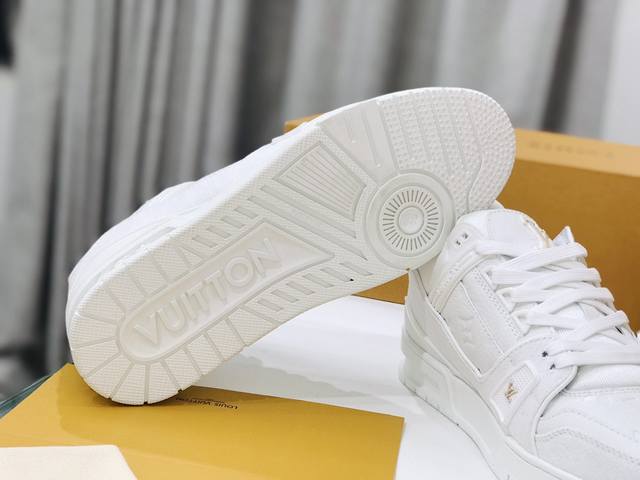 最新配色virgil Abloh 从复古篮球鞋汲取灵感,打造备受青睐的 Lv Trainer 运动鞋。此款鞋履为粒面牛皮革压印标志性 Monogram 图案,与光滑牛皮革共同成就新经典设计。