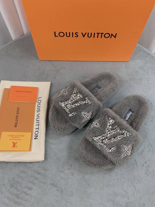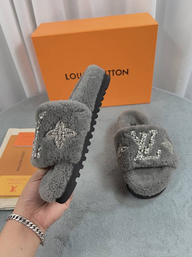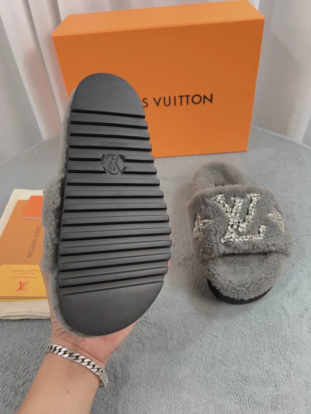 頂级品质纯皮毛一体直毛打造!超温暖的感觉,穿上仿佛踩在云朵上lv经典老花装饰,精致高级!手工缝钻奢华高端让这双毛拖身价陡增!鞋底是原版开模的eva发泡防滑大底,非常好穿不打滑,而且鞋底有一定厚度,舒适度极佳!