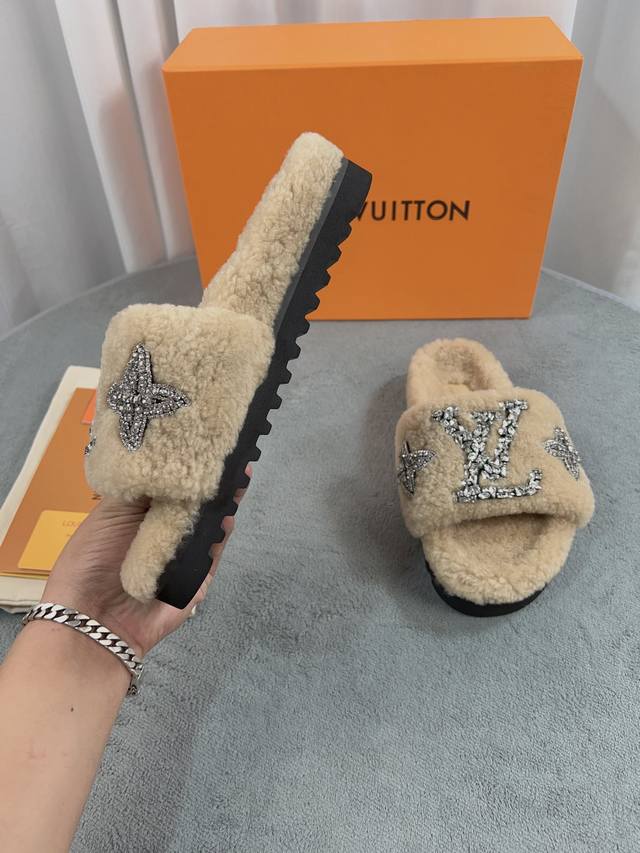頂级品质纯皮毛一体直毛打造!超温暖的感觉,穿上仿佛踩在云朵上lv经典老花装饰,精致高级!手工缝钻奢华高端让这双毛拖身价陡增!鞋底是原版开模的eva发泡防滑大底,非常好穿不打滑,而且鞋底有一定厚度,舒适度极佳!