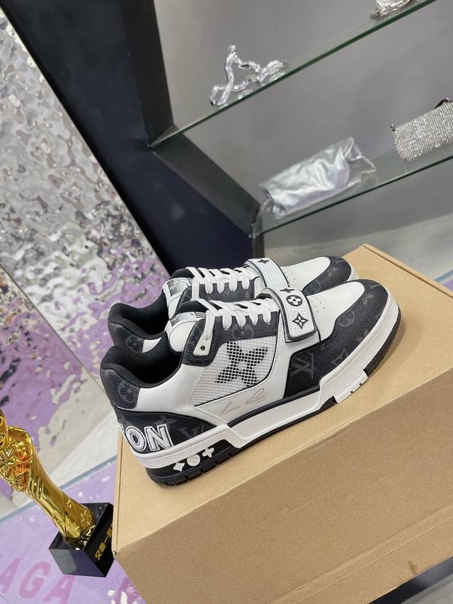 Lv板鞋系列魔术贴# 升级版 #采用正确水洗工艺处理,提花丹宁牛仔布料 区别市面先行版本 进口平纹丝绸小牛皮革鞋面材质#鞋垫嵌入超软脚感pu乳胶物料#后跟耐弯折滴塑支撑片#全原装一致tpu光泽组合鞋底驴的篮球鞋,Virgil Abloh亲自操刀设计!法国巴黎百年奢侈品牌lv路易威登louis Vuitton Trainer Sneaker Low 运动系列低帮魔术贴复古百搭休闲运动文化篮球板鞋